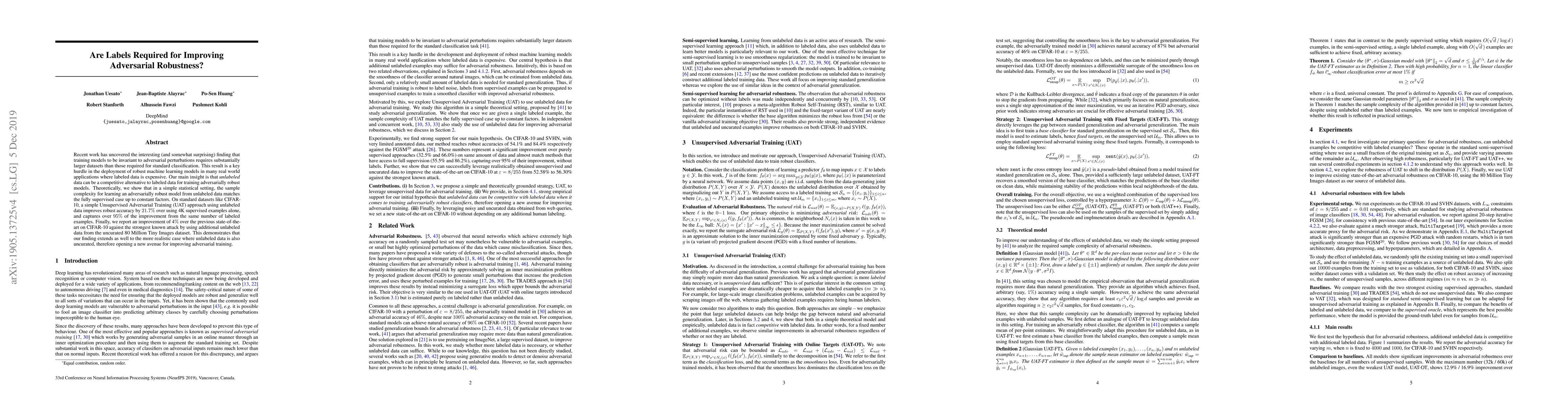 Recent work has uncovered the interesting (and somewhat surprising) finding that training models to be invariant to adversarial perturbations requires substantially larger datasets than those required for standard classification. This result is a key hurdle in the deployment of robust machine learning models in many real world applications where labeled data is expensive. Our main insight is that unlabeled data can be a competitive alternative to labeled data for training adversarially robust models. Theoretically, we show that in a simple statistical setting, the sample complexity for learning an adversarially robust model from unlabeled data matches the fully supervised case up to constant factors. On standard datasets like CIFAR-10, a simple Unsupervised Adversarial Training (UAT) approach using unlabeled data improves robust accuracy by 21.7% over using 4K supervised examples alone, and captures over 95% of the improvement from the same number of labeled examples. Finally, we report an improvement of 4% over the previous state-of-the-art on CIFAR-10 against the strongest known attack by using additional unlabeled data from the uncurated 80 Million Tiny Images dataset. This demonstrates that our finding extends as well to the more realistic case where unlabeled data is also uncurated, therefore opening a new avenue for improving adversarial training.