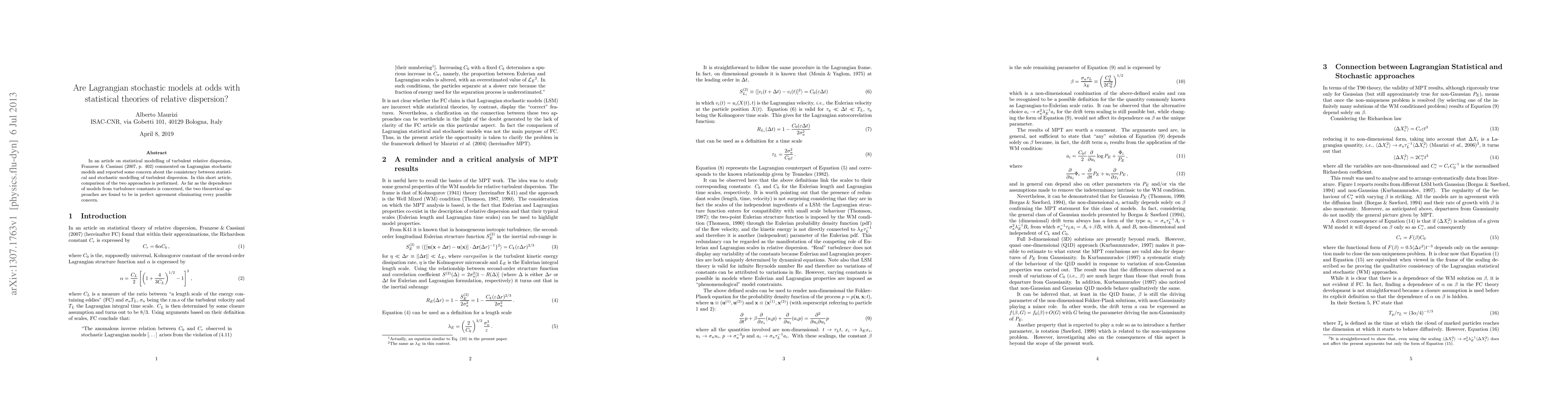 In an article on statistical modelling of turbulent relative dispersion, Franzese & Cassiani (2007, p. 402) commented on Lagrangian stochastic models and reported some concern about the consistency between statisti- cal and stochastic modelling of turbulent dispersion. In this short article, comparison of the two approaches is performed. As far as the dependence of models from turbulence constants is concerned, the two theoretical ap- proaches are found to be in perfect agreement eliminating every possible concern.