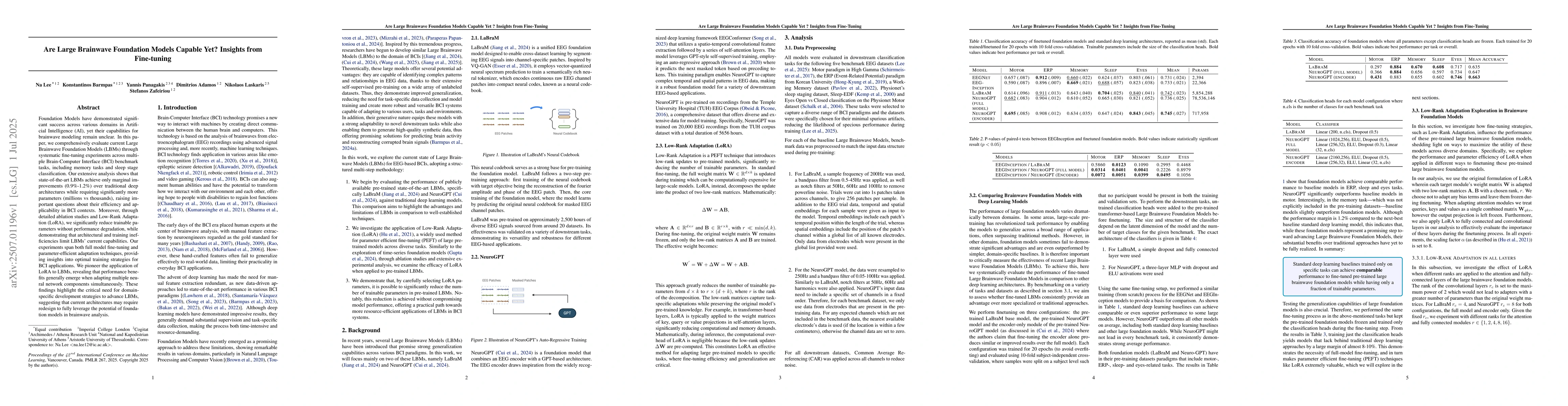 Foundation Models have demonstrated significant success across various domains in Artificial Intelligence (AI), yet their capabilities for brainwave modeling remain unclear. In this paper, we comprehensively evaluate current Large Brainwave Foundation Models (LBMs) through systematic fine-tuning experiments across multiple Brain-Computer Interface (BCI) benchmark tasks, including memory tasks and sleep stage classification. Our extensive analysis shows that state-of-the-art LBMs achieve only marginal improvements (0.9%-1.2%) over traditional deep architectures while requiring significantly more parameters (millions vs thousands), raising important questions about their efficiency and applicability in BCI contexts. Moreover, through detailed ablation studies and Low-Rank Adaptation (LoRA), we significantly reduce trainable parameters without performance degradation, while demonstrating that architectural and training inefficiencies limit LBMs' current capabilities. Our experiments span both full model fine-tuning and parameter-efficient adaptation techniques, providing insights into optimal training strategies for BCI applications. We pioneer the application of LoRA to LBMs, revealing that performance benefits generally emerge when adapting multiple neural network components simultaneously. These findings highlight the critical need for domain-specific development strategies to advance LBMs, suggesting that current architectures may require redesign to fully leverage the potential of foundation models in brainwave analysis.