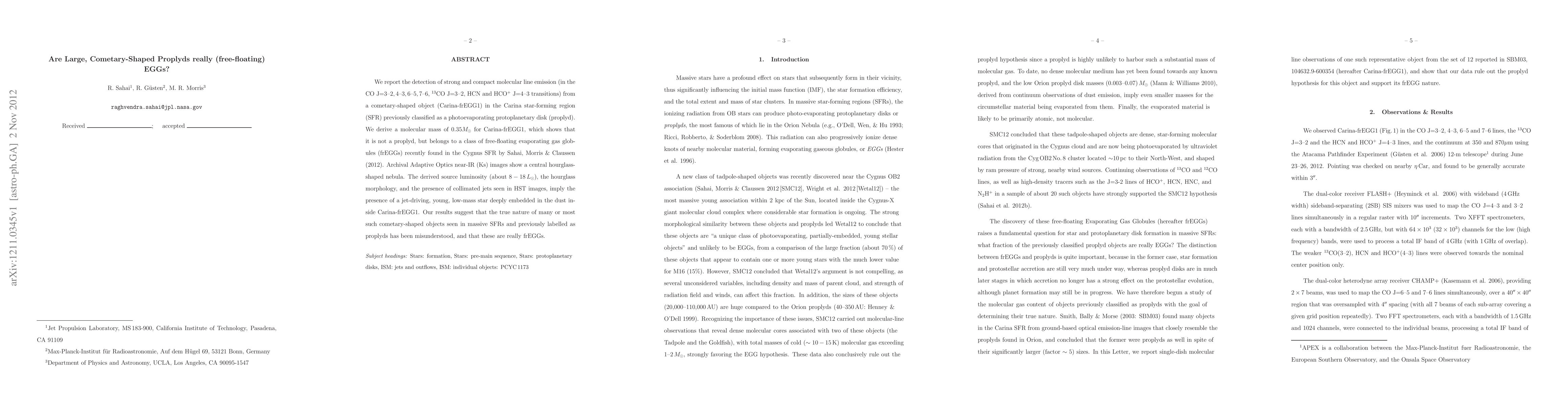 We report the detection of strong and compact molecular line emission (in the CO J=3-2, 4-3, 6-5, 7-6, 13CO J=3-2, HCN and HCO+ J=4-3 transitions) from a cometary-shaped object (Carina-frEGG1) in the Carina star-forming region (SFR) previously classified as a photoevaporating protoplanetary disk (proplyd). We derive a molecular mass of 0.35 Msun for Carina-frEGG1, which shows that it is not a proplyd, but belongs to a class of free-floating evaporating gas globules (frEGGs) recently found in the Cygnus SFR by Sahai, Morris & Claussen (2012). Archival Adaptive Optics near-IR (Ks) images show a central hourglass-shaped nebula. The derived source luminosity (about 8-18 Lsun), the hourglass morphology, and the presence of collimated jets seen in HST images, imply the presence of a jet-driving, young, low-mass star deeply embedded in the dust inside Carina-frEGG1. Our results suggest that the true nature of many or most such cometary-shaped objects seen in massive SFRs and previously labelled as proplyds has been misunderstood, and that these are really frEGGs.