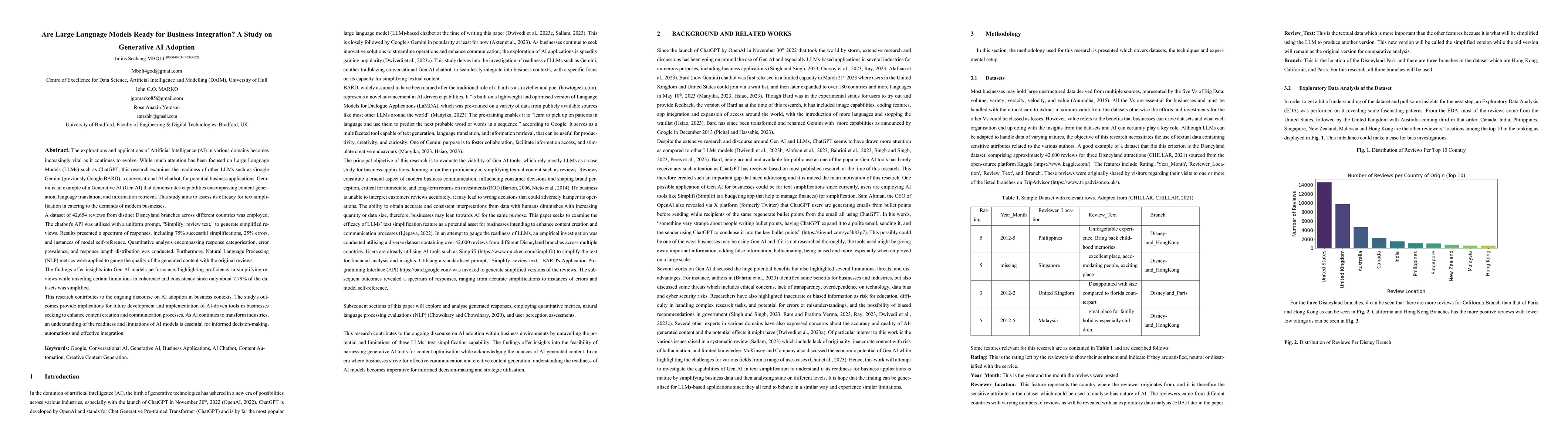 The explorations and applications of Artificial Intelligence (AI) in various domains becomes increasingly vital as it continues to evolve. While much attention has been focused on Large Language Models (LLMs) such as ChatGPT, this research examines the readiness of other LLMs such as Google Gemini (previously Google BARD), a conversational AI chatbot, for potential business applications. Gemini is an example of a Generative AI (Gen AI) that demonstrates capabilities encompassing content generation, language translation, and information retrieval. This study aims to assess its efficacy for text simplification in catering to the demands of modern businesses. A dataset of 42,654 reviews from distinct Disneyland branches was employed. The chatbot's API was utilised with a uniform prompt to generate simplified re-views. Results presented a spectrum of responses, including 75% successful simplifications, 25% errors, and instances of model self-reference. Quantitative analysis encompassing response categorisation, error prevalence, and response length distribution was conducted. Furthermore, Natural Language Processing (NLP) metrics were applied to gauge the quality of the generated content with the original reviews. The findings offer insights into Gen AI models performance, highlighting proficiency in simplifying re-views while unveiling certain limitations in coherence and consistency since only about 7.79% of the datasets was simplified. This research contributes to the ongoing discourse on AI adoption in business contexts. The study's out-comes provide implications for future development and implementation of AI-driven tools in businesses seeking to enhance content creation and communication processes. As AI continues to transform industries, an understanding of the readiness and limitations of AI models is essential for informed decision-making, automations and effective integration.