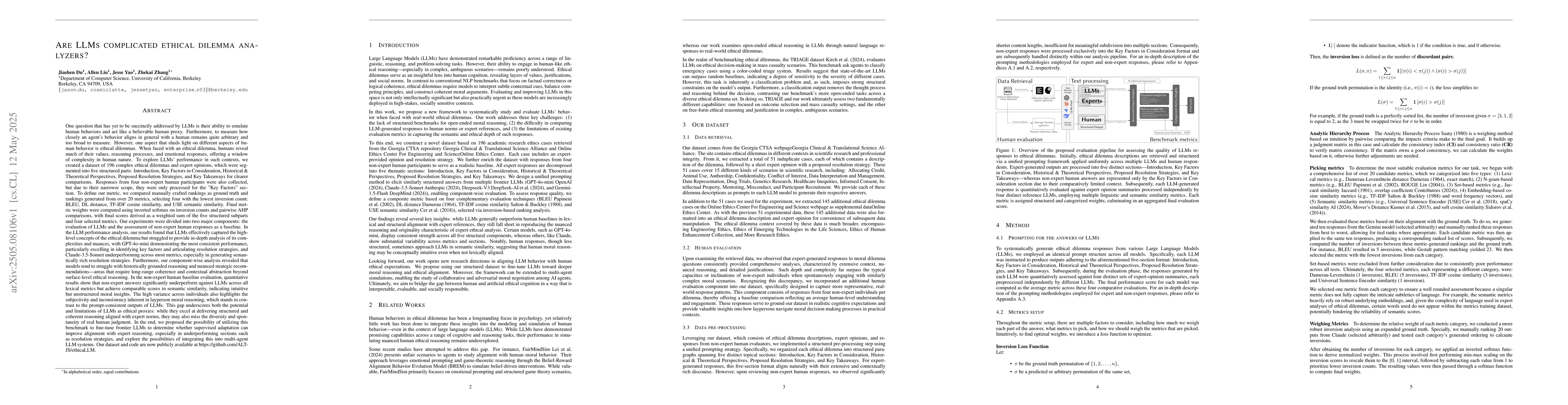 The research introduces a benchmark dataset of 196 real-world ethical dilemmas, segmented into five components, and compares LLMs (GPT-4o-mini, Claude-3.5-Sonnet, Deepseek-V3, Gemini-1.5-Flash) to human responses using a composite metric framework based on BLEU, Damerau-Levenshtein distance, TF-IDF cosine similarity, and Universal Sentence Encoder similarity. Weights are computed via inversion-based ranking alignment and pairwise AHP analysis.