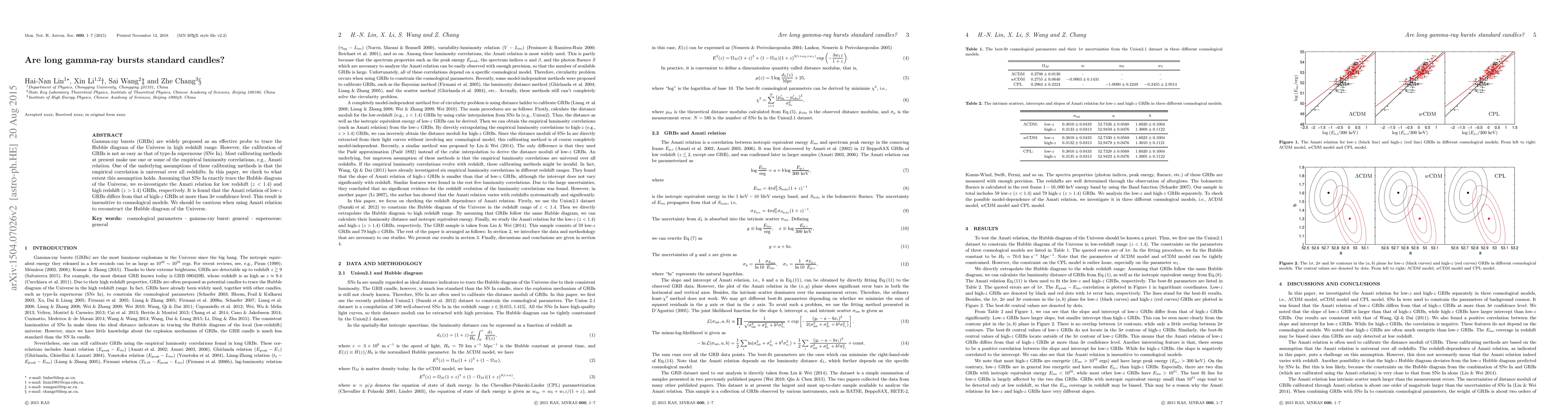 This paper investigates whether long gamma-ray bursts (GRBs) can serve as standard candles by examining the universality of the Amati relation across different redshifts. It finds that the Amati relation significantly differs for low-$z$ versus high-$z$ GRBs, cautioning against using it to reconstruct the Hubble diagram.