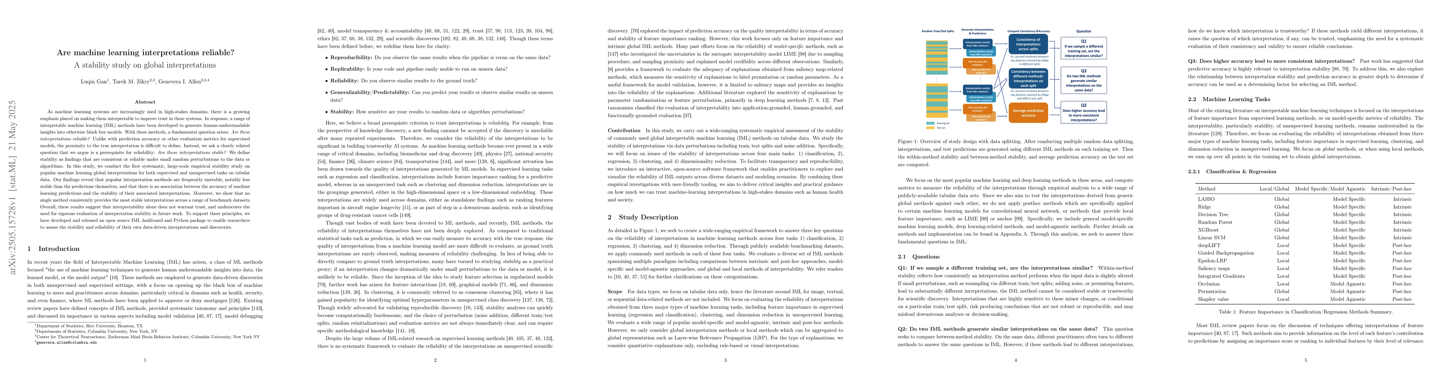 This research is novel as it is the first systematic, large-scale empirical study on the stability of popular machine learning global interpretations, highlighting the discrepancy between prediction accuracy and interpretation stability.