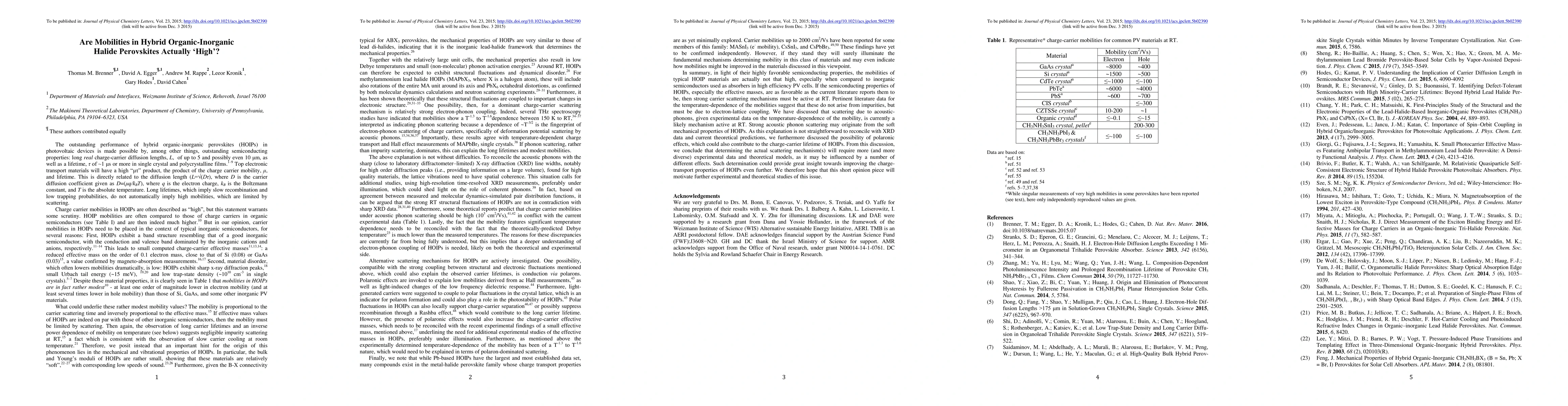 We present an experimental and theoretical viewpoint on the electronic carrier mobilities of typical hybrid organic-inorganic perovskites (HOIPs). While these mobilities are often quoted as high, a review of them shows that although otherwise the semiconducting properties of HOIPs are impressively good, mobilities of HOIPs used in most solar cells are actually not that high. This is especially apparent if they are compared to those of inorganic semiconductors used in other high efficiency solar cells. We critically examine possible causes and focus on electron-lattice coupling mechanisms that are active at room temperature, and can lead to carrier scattering. From this, we propose scattering due to acoustic phonons or polarons as possible causes, but also point out the difficulties with each of these in view of additional experimental and theoretical findings in the literature. Further research in this direction will contribute to making HOIP solar cells even more efficient than they already are.