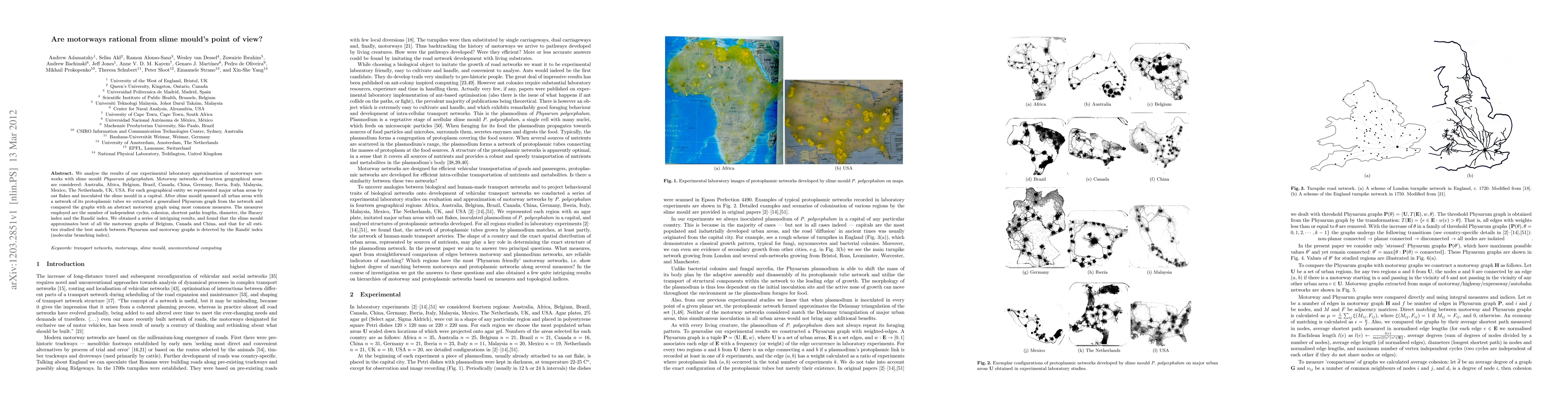 This study investigates whether motorway networks resemble the growth patterns of slime mould Physarum polycephalum. The research found that the slime mould best matches the motorway networks of Belgium, Canada, and China, with the Randic index being the most effective measure for this comparison.