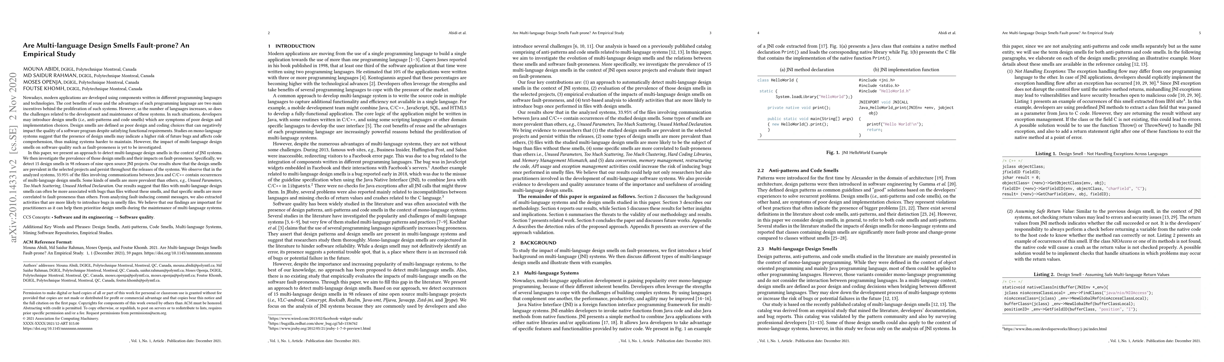 This paper investigates the prevalence and impact of multi-language design smells in JNI systems, detecting 15 types in 98 releases of nine open-source projects. Findings indicate that such smells are common and often correlate with higher fault-proneness, suggesting they negatively affect code quality and maintenance.