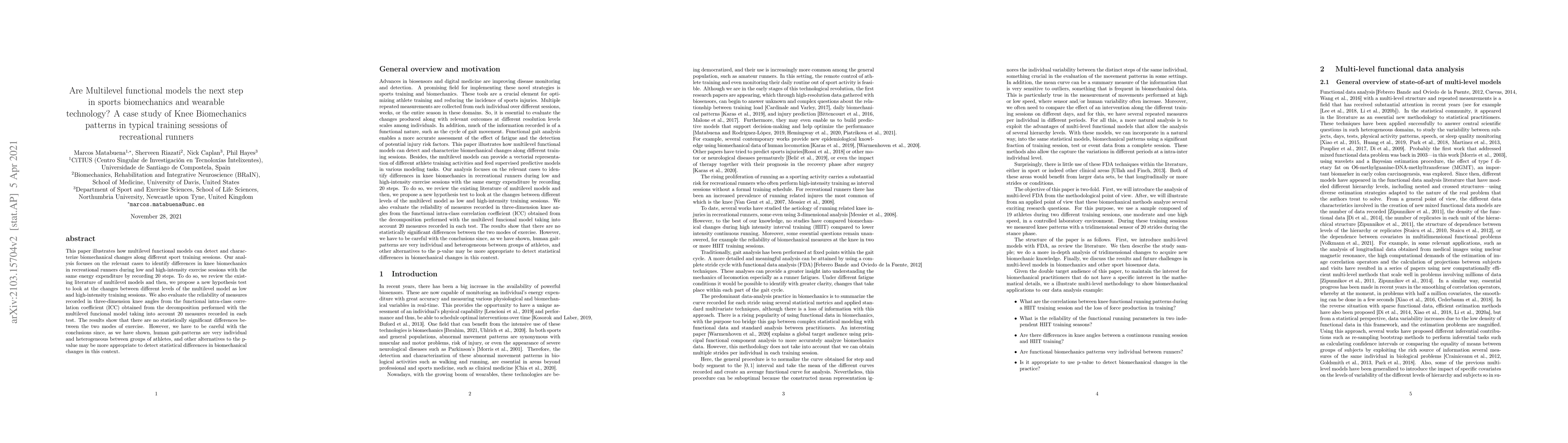 This paper illustrates how multilevel functional models can detect and characterize biomechanical changes along different sport training sessions. Our analysis focuses on the relevant cases to identify differences in knee biomechanics in recreational runners during low and high-intensity exercise sessions with the same energy expenditure by recording $20$ steps. To do so, we review the existing literature of multilevel models, and then, we propose a new hypothesis test to look at the changes between different levels of the multilevel model as low and high-intensity training sessions. We also evaluate the reliability of measures recorded in three-dimension knee angles from the functional intra-class correlation coefficient (ICC) obtained from the decomposition performed with the multilevel funcional model taking into account $20$ measures recorded in each test. The results show that there are no statistically significant differences between the two modes of exercise. However, we have to be careful with the conclusions since, as we have shown, human gait-patterns are very individual and heterogeneous between groups of athletes, and other alternatives to the p-value may be more appropriate to detect statistical differences in biomechanical changes in this context.