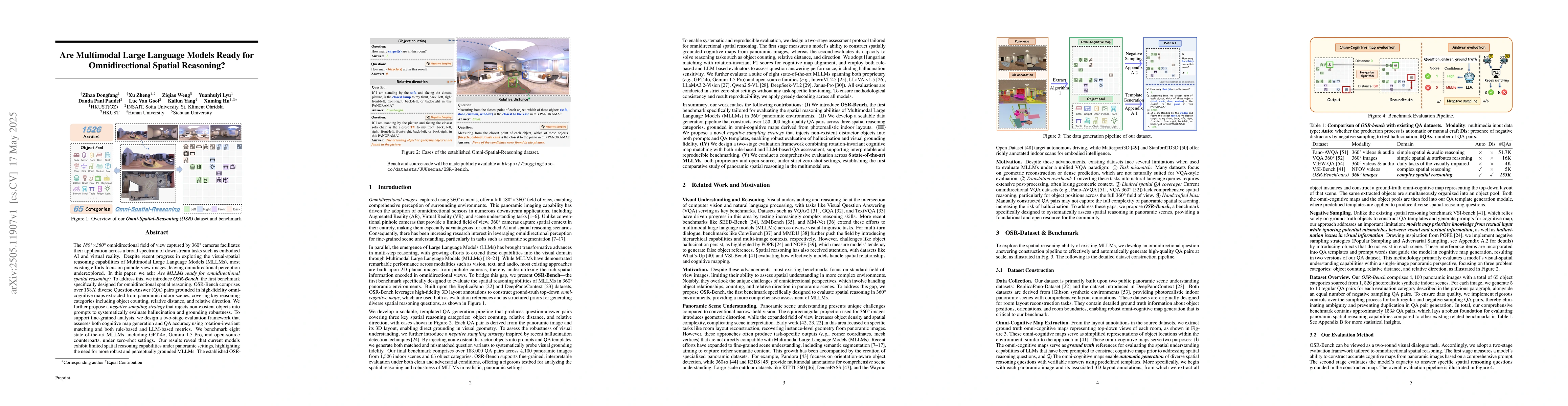 OSR-Bench, a benchmark for omnidirectional spatial reasoning, along with a negative sampling strategy for evaluating hallucination and grounding robustness.