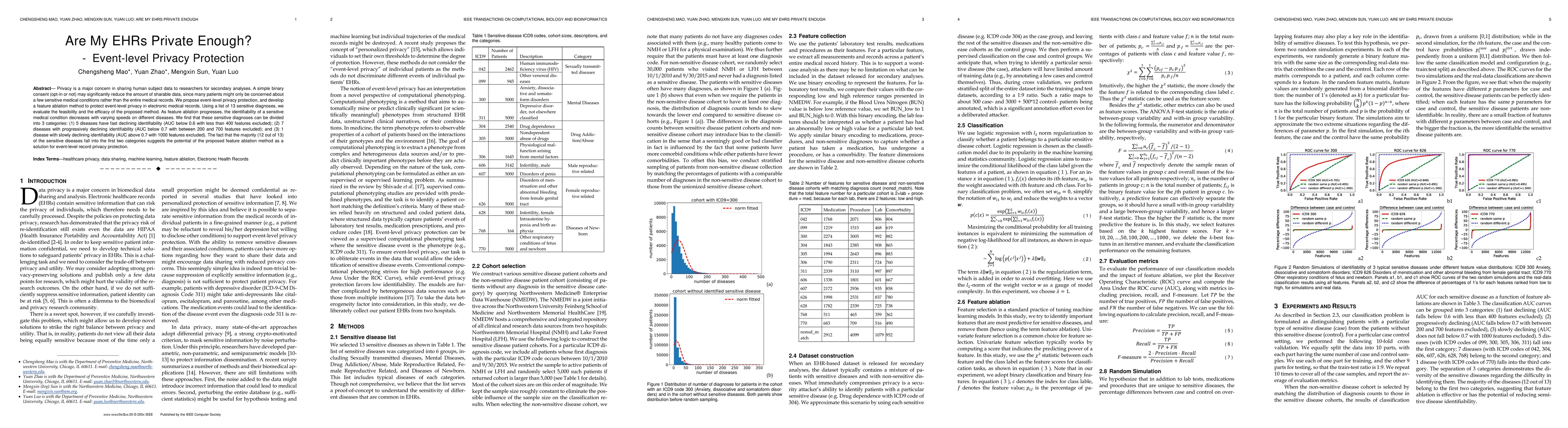 This paper proposes an event-level privacy protection method for electronic health records (EHR) to enhance data sharing security. It categorizes 13 sensitive diagnoses based on their declining identifiability with feature ablation, showing that most (12/13) can achieve acceptable privacy with less than 700 features excluded.