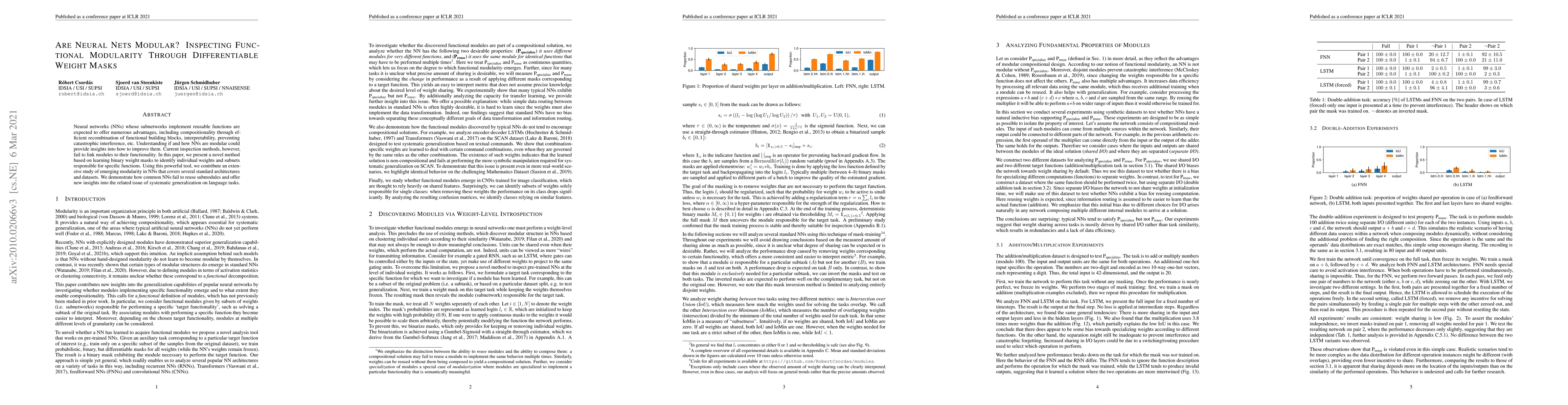 Neural networks (NNs) whose subnetworks implement reusable functions are expected to offer numerous advantages, including compositionality through efficient recombination of functional building blocks, interpretability, preventing catastrophic interference, etc. Understanding if and how NNs are modular could provide insights into how to improve them. Current inspection methods, however, fail to link modules to their functionality. In this paper, we present a novel method based on learning binary weight masks to identify individual weights and subnets responsible for specific functions. Using this powerful tool, we contribute an extensive study of emerging modularity in NNs that covers several standard architectures and datasets. We demonstrate how common NNs fail to reuse submodules and offer new insights into the related issue of systematic generalization on language tasks.