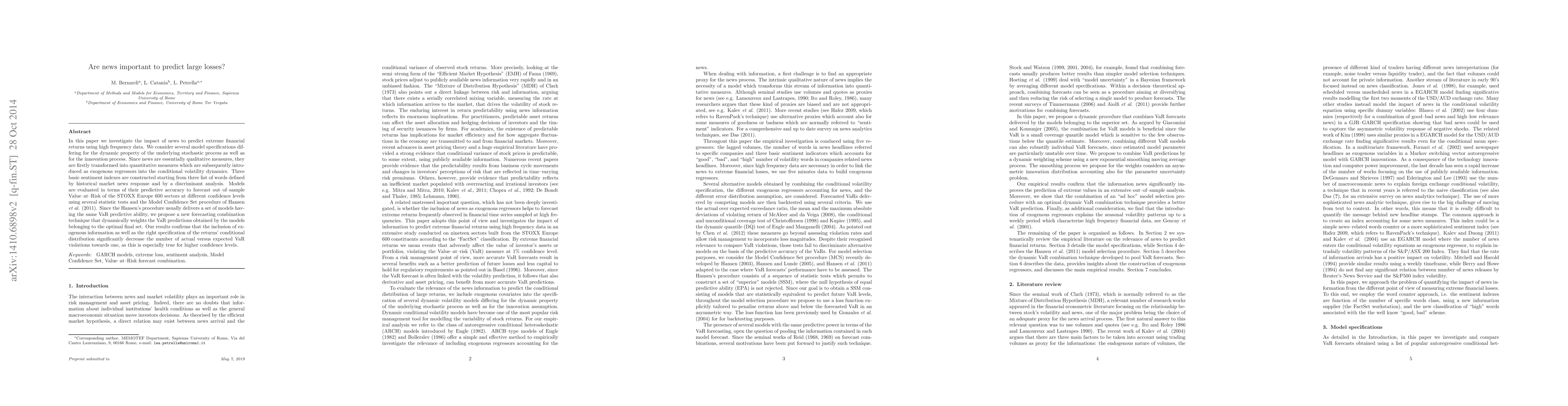 In this paper we investigate the impact of news to predict extreme financial returns using high frequency data. We consider several model specifications differing for the dynamic property of the underlying stochastic process as well as for the innovation process. Since news are essentially qualitative measures, they are firstly transformed into quantitative measures which are subsequently introduced as exogenous regressors into the conditional volatility dynamics. Three basic sentiment indexes are constructed starting from three list of words defined by historical market news response and by a discriminant analysis. Models are evaluated in terms of their predictive accuracy to forecast out-of-sample Value-at-Risk of the STOXX Europe 600 sectors at different confidence levels using several statistic tests and the Model Confidence Set procedure of Hansen et al. (2011). Since the Hansen's procedure usually delivers a set of models having the same VaR predictive ability, we propose a new forecasting combination technique that dynamically weights the VaR predictions obtained by the models belonging to the optimal final set. Our results confirms that the inclusion of exogenous information as well as the right specification of the returns' conditional distribution significantly decrease the number of actual versus expected VaR violations towards one, as this is especially true for higher confidence levels.