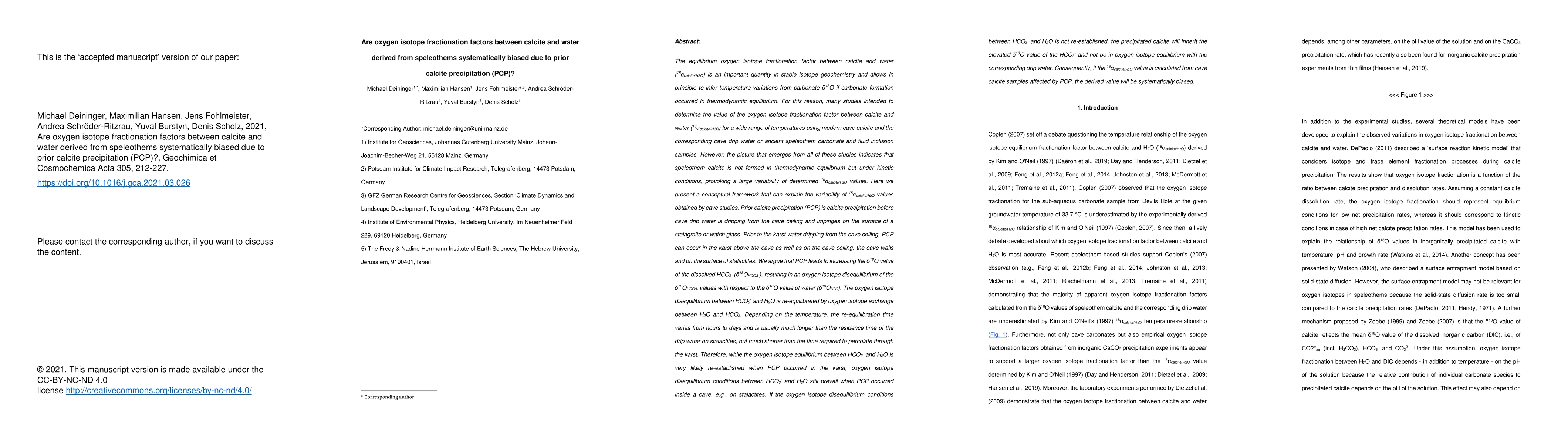 This paper investigates whether oxygen isotope fractionation factors between calcite and water derived from speleothems are systematically biased due to prior calcite precipitation (PCP). The study argues that PCP causes an increase in the δ¹⁸O value of dissolved HCO₃⁻, leading to isotope disequilibrium, which can skew the fractionation factors and thus temperature inferences derived from speleothem δ¹⁸O values.