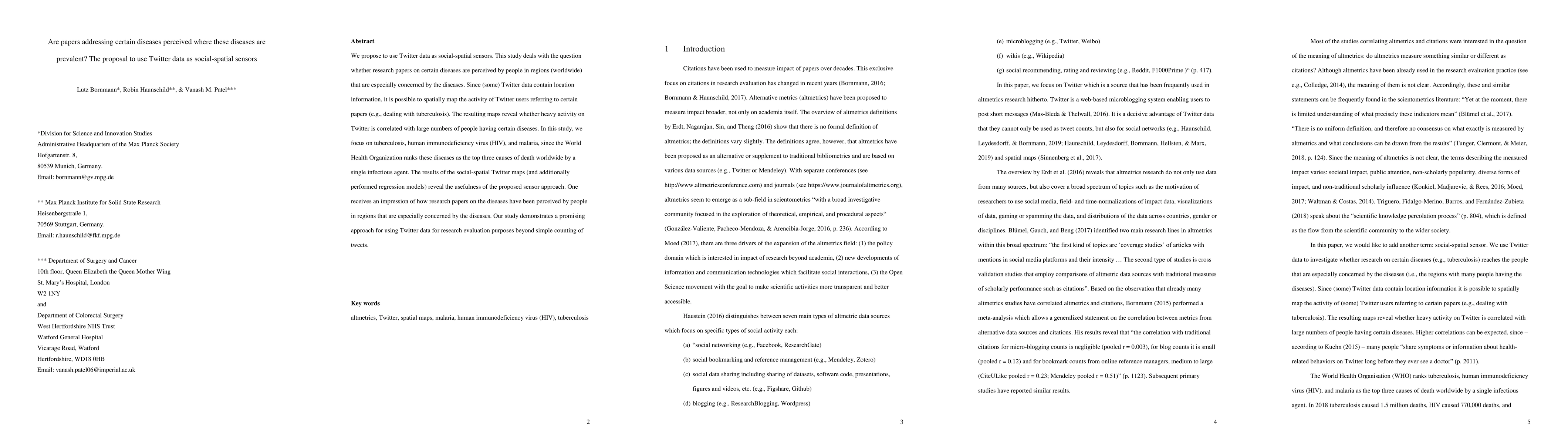 We propose to use Twitter data as social-spatial sensors. This study deals with the question whether research papers on certain diseases are perceived by people in regions (worldwide) that are especially concerned by the diseases. Since (some) Twitter data contain location information, it is possible to spatially map the activity of Twitter users referring to certain papers (e.g., dealing with tuberculosis). The resulting maps reveal whether heavy activity on Twitter is correlated with large numbers of people having certain diseases. In this study, we focus on tuberculosis, human immunodeficiency virus (HIV), and malaria, since the World Health Organization ranks these diseases as the top three causes of death worldwide by a single infectious agent. The results of the social-spatial Twitter maps (and additionally performed regression models) reveal the usefulness of the proposed sensor approach. One receives an impression of how research papers on the diseases have been perceived by people in regions that are especially concerned by the diseases. Our study demonstrates a promising approach for using Twitter data for research evaluation purposes beyond simple counting of tweets.