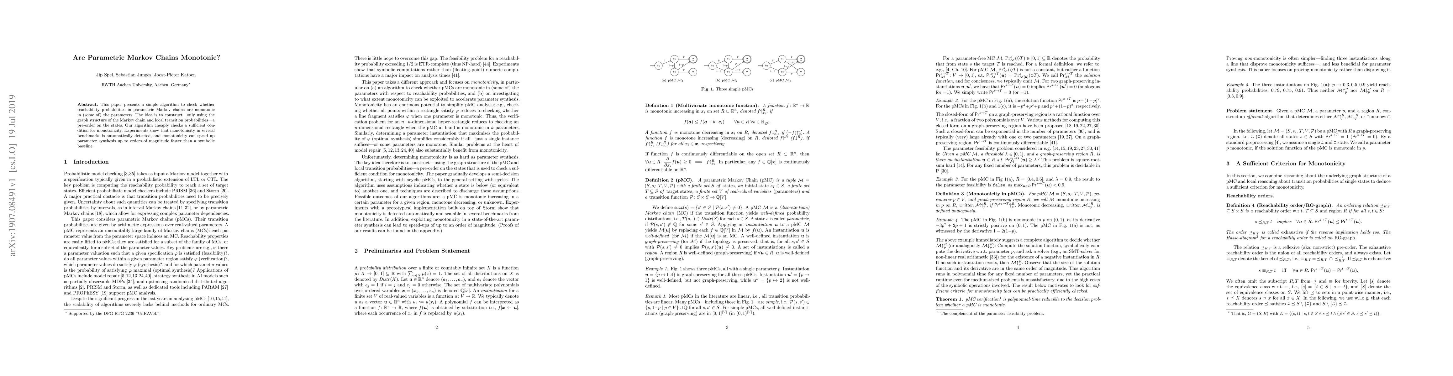 The paper introduces an efficient algorithm to check monotonicity in parametric Markov chains, reducing the problem to a decision problem concerning the reachability order of states.