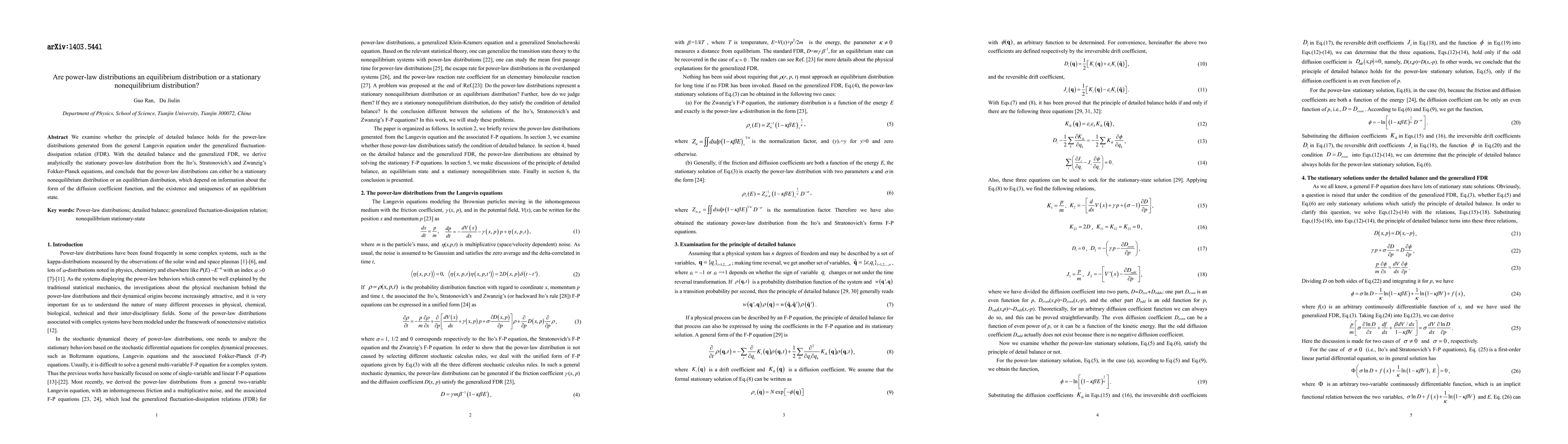 This paper investigates whether power-law distributions arise from equilibrium or stationary nonequilibrium processes, deriving these distributions analytically from various Fokker-Planck equations under generalized fluctuation-dissipation relations, concluding that their nature depends on the diffusion coefficient and the equilibrium state.
