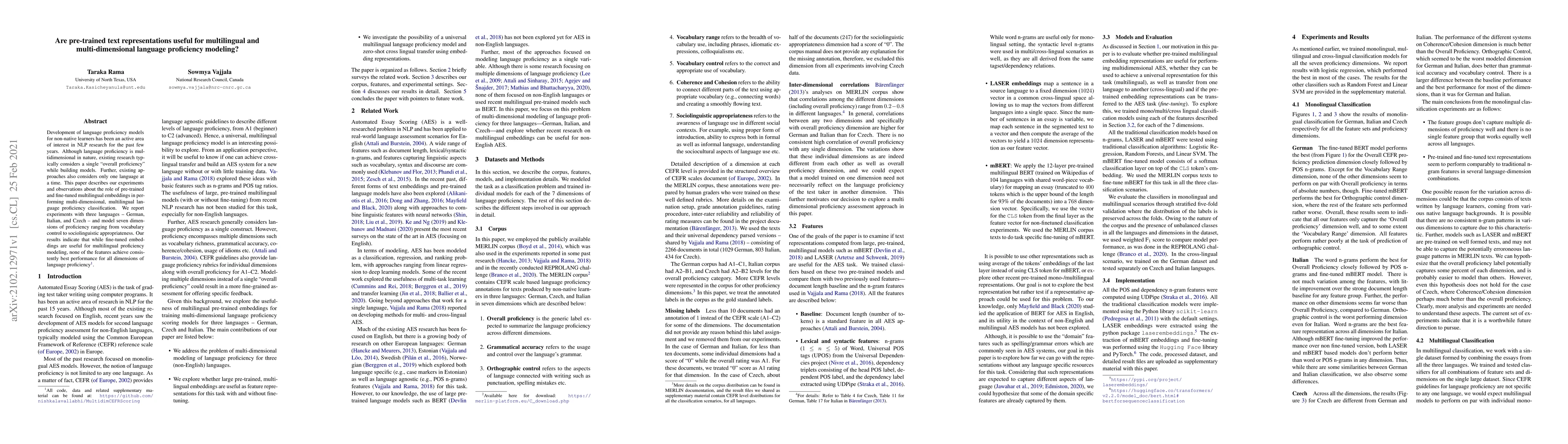 Pre-trained text representations can aid in multilingual language proficiency modeling, but their effectiveness varies across different dimensions of proficiency. Fine-tuned models show promise, yet no feature consistently achieves the best results for all dimensions.