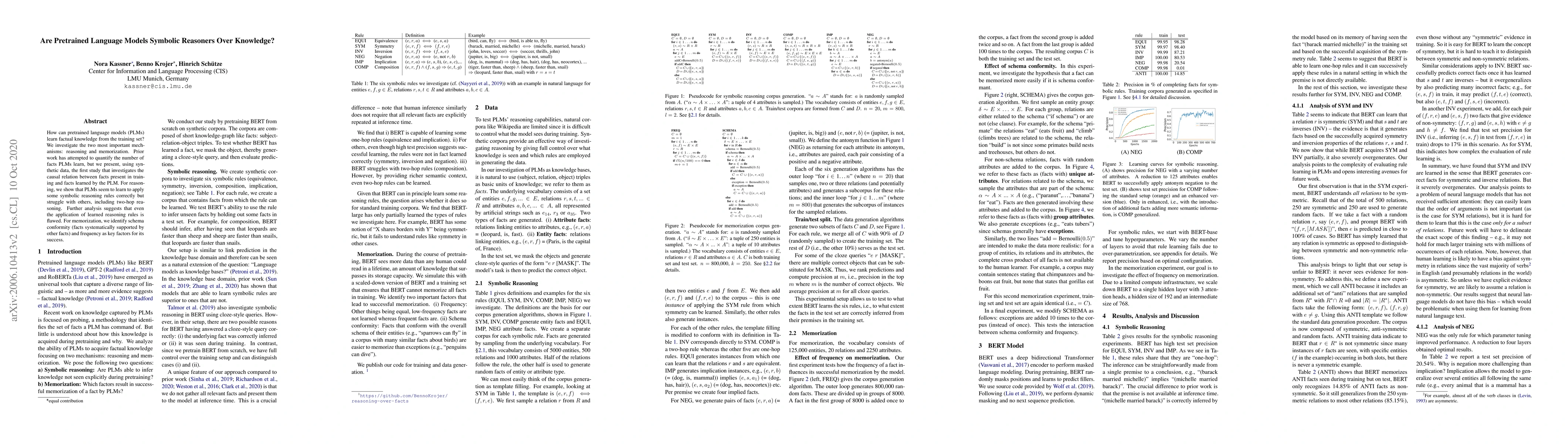 This paper investigates how pretrained language models (PLMs) acquire factual knowledge, finding that while they can apply some symbolic reasoning rules correctly, they struggle with complex reasoning and memorization is influenced by schema conformity and frequency.