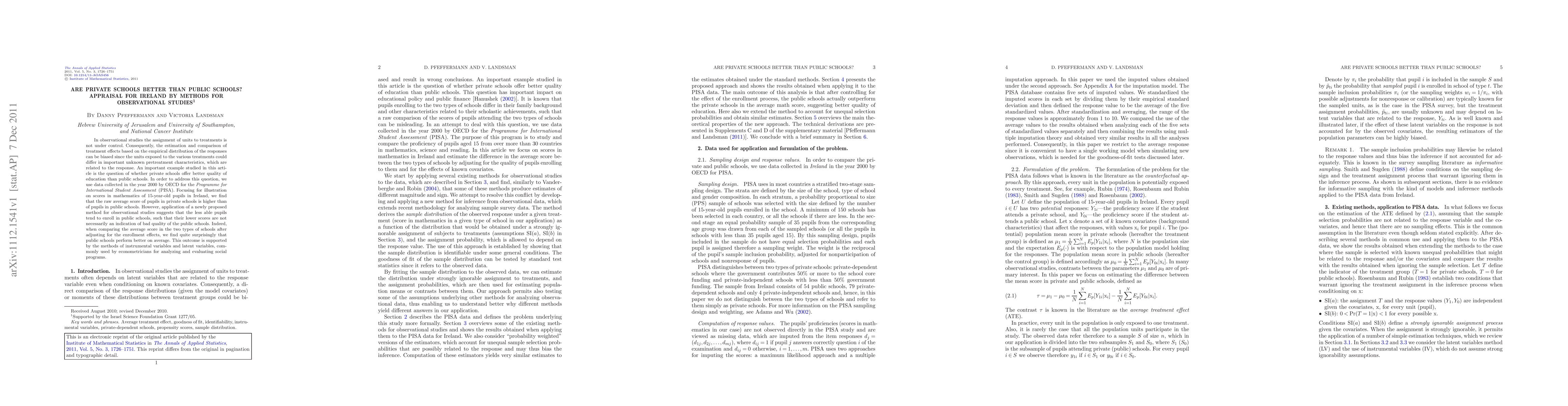 In observational studies the assignment of units to treatments is not under control. Consequently, the estimation and comparison of treatment effects based on the empirical distribution of the responses can be biased since the units exposed to the various treatments could differ in important unknown pretreatment characteristics, which are related to the response. An important example studied in this article is the question of whether private schools offer better quality of education than public schools. In order to address this question, we use data collected in the year 2000 by OECD for the Programme for International Student Assessment (PISA). Focusing for illustration on scores in mathematics of 15-year-old pupils in Ireland, we find that the raw average score of pupils in private schools is higher than of pupils in public schools. However, application of a newly proposed method for observational studies suggests that the less able pupils tend to enroll in public schools, such that their lower scores are not necessarily an indication of bad quality of the public schools. Indeed, when comparing the average score in the two types of schools after adjusting for the enrollment effects, we find quite surprisingly that public schools perform better on average. This outcome is supported by the methods of instrumental variables and latent variables, commonly used by econometricians for analyzing and evaluating social programs.