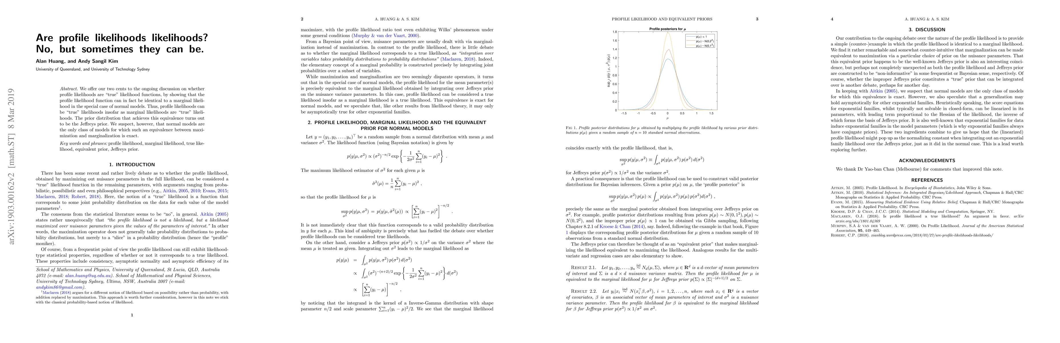 This paper argues that profile likelihoods can be considered "true" likelihoods in the context of normal models, where they are equivalent to marginal likelihoods, particularly when using the Jeffreys prior. It suggests that this equivalence is exact only for normal models.