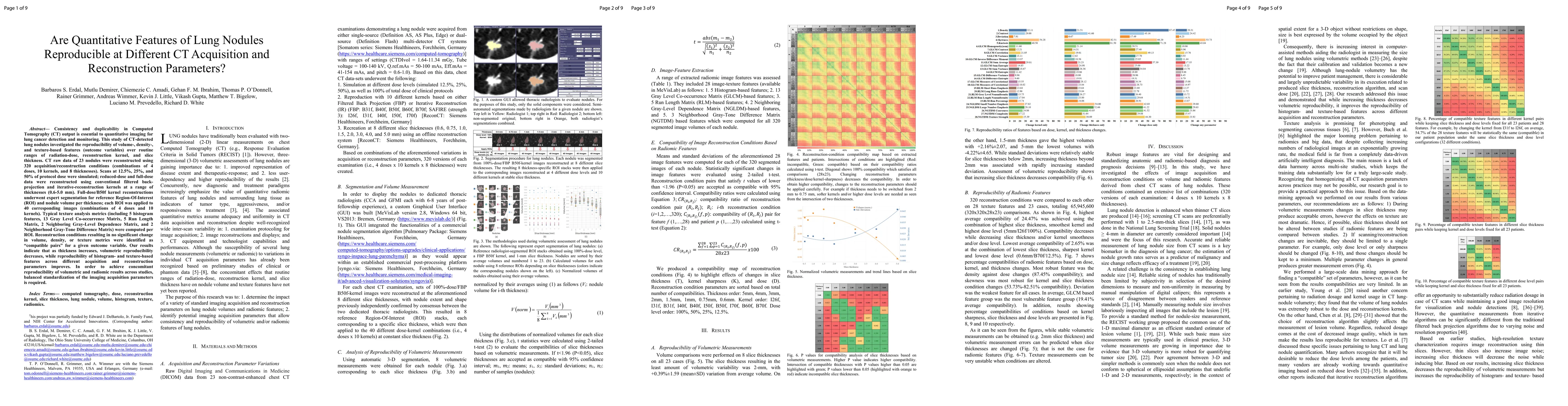 Consistency and duplicability in Computed Tomography (CT) output is essential to quantitative imaging for lung cancer detection and monitoring. This study of CT-detected lung nodules investigated the reproducibility of volume-, density-, and texture-based features (outcome variables) over routine ranges of radiation-dose, reconstruction kernel, and slice thickness. CT raw data of 23 nodules were reconstructed using 320 acquisition/reconstruction conditions (combinations of 4 doses, 10 kernels, and 8 thicknesses). Scans at 12.5%, 25%, and 50% of protocol dose were simulated; reduced-dose and full-dose data were reconstructed using conventional filtered back-projection and iterative-reconstruction kernels at a range of thicknesses (0.6-5.0 mm). Full-dose/B50f kernel reconstructions underwent expert segmentation for reference Region-Of-Interest (ROI) and nodule volume per thickness; each ROI was applied to 40 corresponding images (combinations of 4 doses and 10 kernels). Typical texture analysis metrics (including 5 histogram features, 13 Gray Level Co-occurrence Matrix, 5 Run Length Matrix, 2 Neighboring Gray-Level Dependence Matrix, and 2 Neighborhood Gray-Tone Difference Matrix) were computed per ROI. Reconstruction conditions resulting in no significant change in volume, density, or texture metrics were identified as "compatible pairs" for a given outcome variable. Our results indicate that as thickness increases, volumetric reproducibility decreases, while reproducibility of histogram- and texture-based features across different acquisition and reconstruction parameters improves. In order to achieve concomitant reproducibility of volumetric and radiomic results across studies, balanced standardization of the imaging acquisition parameters is required.