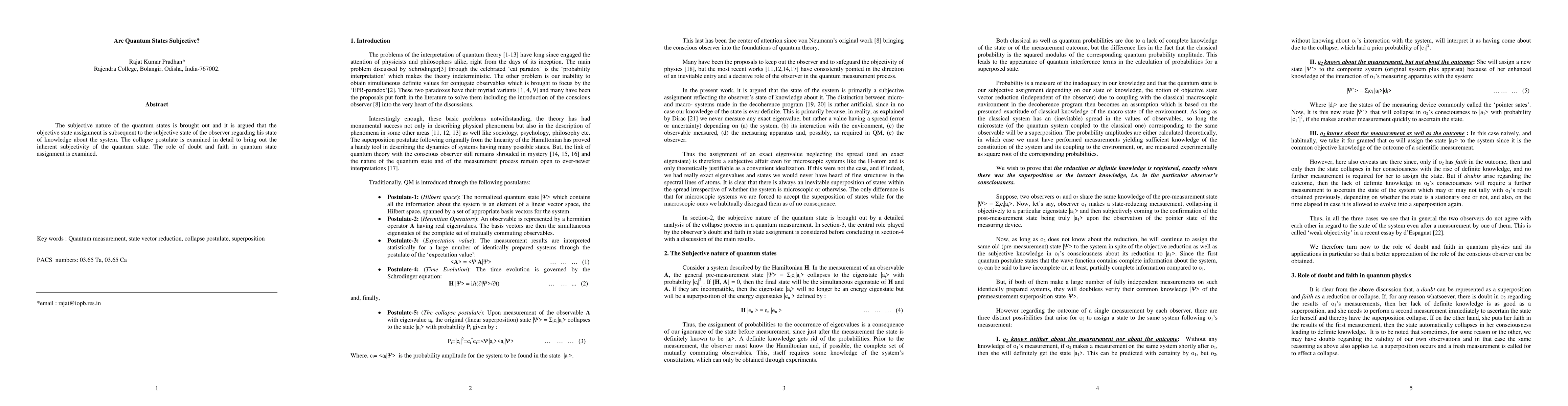 The subjective nature of the quantum states is brought out and it is argued that the objective state assignment is subsequent to the subjective state of the observer regarding his state of knowledge about the system. The collapse postulate is examined in detail to bring out the inherent subjectivity of the quantum state. The role of doubt and faith in quantum state assignment is examined.