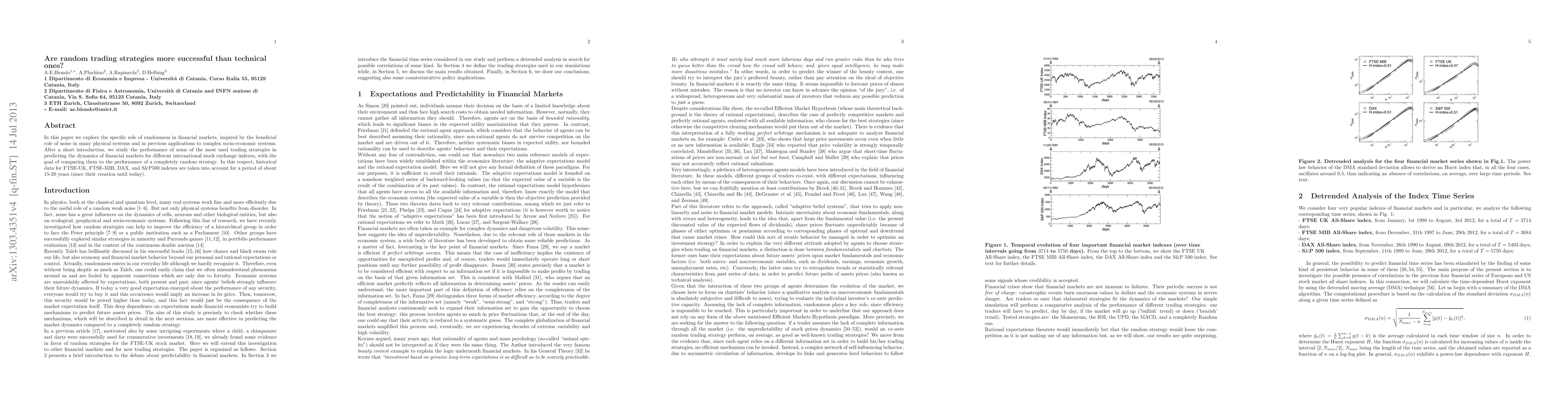 In this paper we explore the specific role of randomness in financial markets, inspired by the beneficial role of noise in many physical systems and in previous applications to complex socio- economic systems. After a short introduction, we study the performance of some of the most used trading strategies in predicting the dynamics of financial markets for different international stock exchange indexes, with the goal of comparing them with the performance of a completely random strategy. In this respect, historical data for FTSE-UK, FTSE-MIB, DAX, and S&P500 indexes are taken into account for a period of about 15-20 years (since their creation until today).