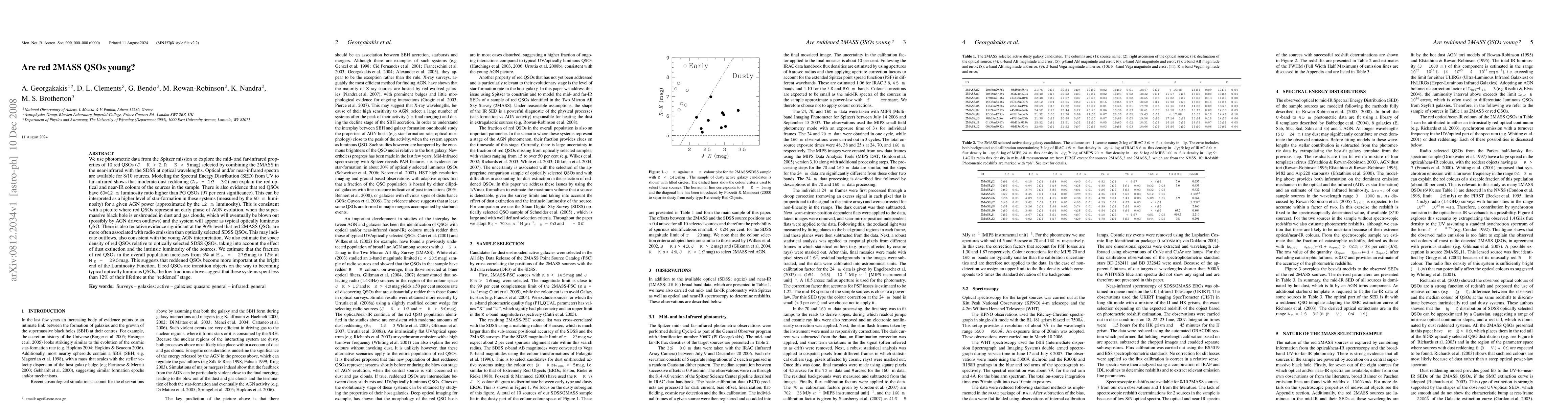 We use photometric data from Spitzer to explore the mid- and far-IR properties of 10 red QSOs (J-K>2, R-K>5) selected by combining the 2MASS in the NIR with the SDSS at optical wavelengths. Optical and/or near-infrared spectra are available for 8/10 sources. Modeling the SED from UV to far-IR shows that moderate dust reddening (A_V=1.3-3.2) can explain the red optical and near-IR colours of the sources in the sample. There is also evidence that red QSOs have 60/12micron luminosity ratio higher than PG QSOs (97% significance). This can be interpreted as a higher level of star-formation in these systems (measured by the 60micron luminosity) for a given AGN power (approximated by the 12micron luminosity). This is consistent with a picture where red QSOs represent an early phase of AGN evolution, when the supermassive black hole is enshrouded in dust and gas clouds, which will eventually be blown out (possibly by AGN driven outflows) and the system will appear as typical optically luminous QSO. There is also tentative evidence significant at the 96% level that red 2MASS QSOs are more often associated with radio emission than optically selected SDSS QSOs. This may indicate outflows, also consistent with the young AGN interpretation. We also estimate the space density of red QSOs relative to optically selected SDSS QSOs, taking into account the effect of dust extinction and the intrinsic luminosity of the sources. We estimate that the fraction of red QSOs in the overall population increases from 3% at M_K=-27.5mag to 12% at M_K=-29.5mag. This suggests that reddened QSOs become more important at the bright end of the Luminosity Function. If red QSOs are transition objects on the way to becoming typical optically luminous QSOs, the low fractions above suggest that these systems spent <12% of their lifetime at the "reddened" stage.