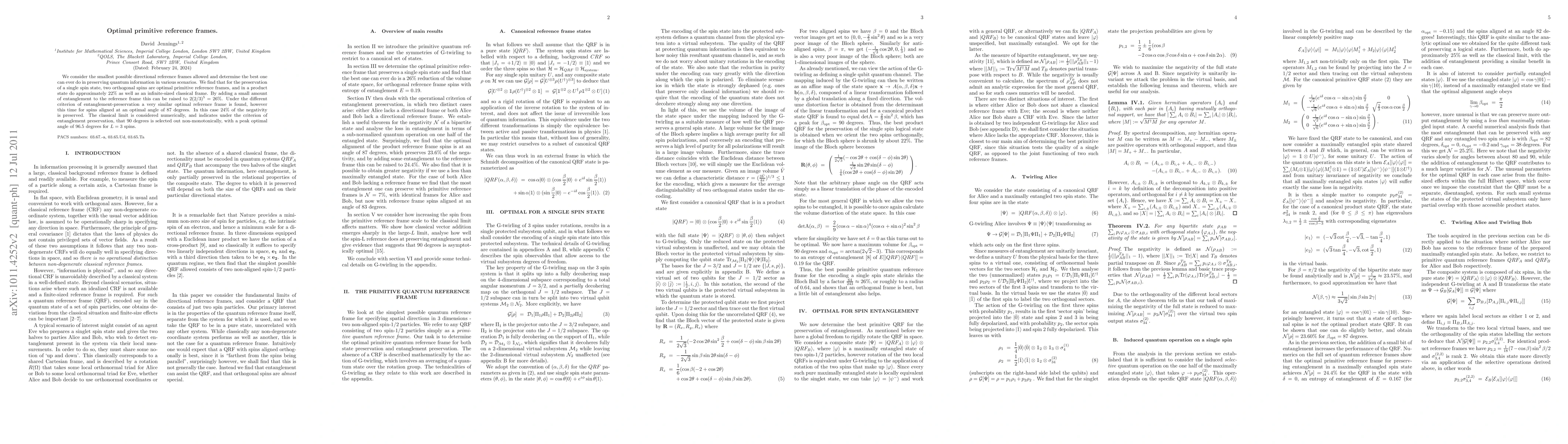 We consider the smallest possible directional reference frames allowed and determine the best one can ever do in preserving quantum information in various scenarios. We find that for the preservation of a single spin state, two orthogonal spins are optimal primitive reference frames, and in a product state do approximately 22% as well as an infinite-sized classical frame. By adding a small amount of entanglement to the reference frame this can be raised to 2(2/3)^5 = 26%. Under the different criterion of entanglement-preservation a very similar optimal reference frame is found, however this time for spins aligned at an optimal angle of 87 degrees. In this case 24% of the negativity is preserved. The classical limit is considered numerically, and indicates under the criterion of entanglement preservation, that 90 degrees is selected out non-monotonically, with a peak optimal angle of 96.5 degrees for L = 3 spins.