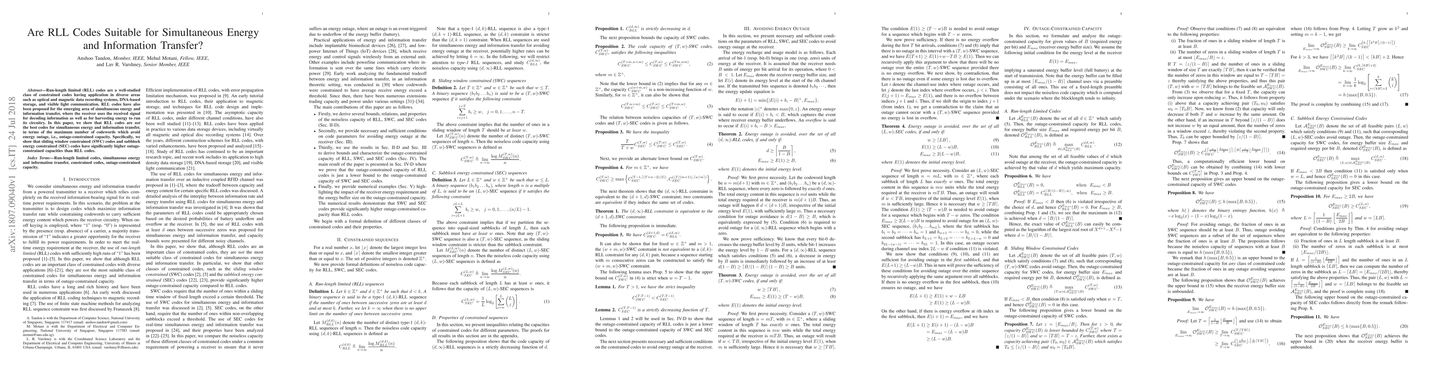This paper investigates the suitability of run-length limited (RLL) codes for simultaneous energy and information transfer, finding that RLL codes are suboptimal. It shows that sliding window constrained (SWC) and subblock energy constrained (SEC) codes outperform RLL codes in terms of outage-constrained capacity.