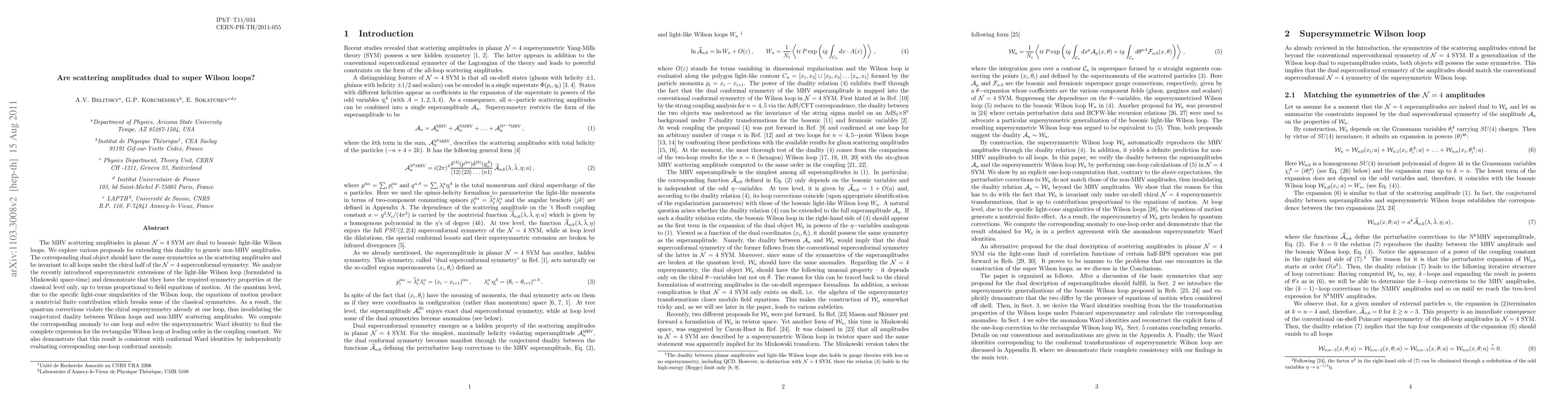 This paper investigates the duality between MHV scattering amplitudes in N=4 SYM and Wilson loops, extending the analysis to non-MHV amplitudes. It finds that while classical supersymmetric Wilson loops exhibit required symmetries, quantum corrections violate chiral supersymmetry at one loop, invalidating the proposed duality.