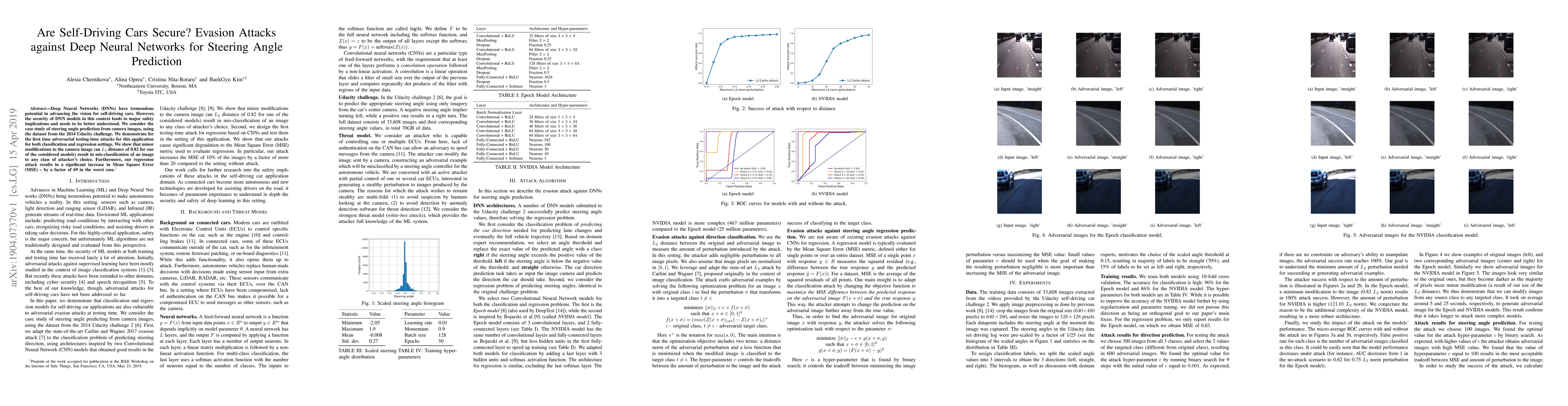 This paper investigates security vulnerabilities in Deep Neural Networks (DNNs) used for self-driving car steering angle prediction, revealing that minor adversarial modifications to camera images can misclassify the steering angle, leading to severe safety risks. The study demonstrates significant Mean Square Error increases in regression attacks, highlighting the need for robust security measures.