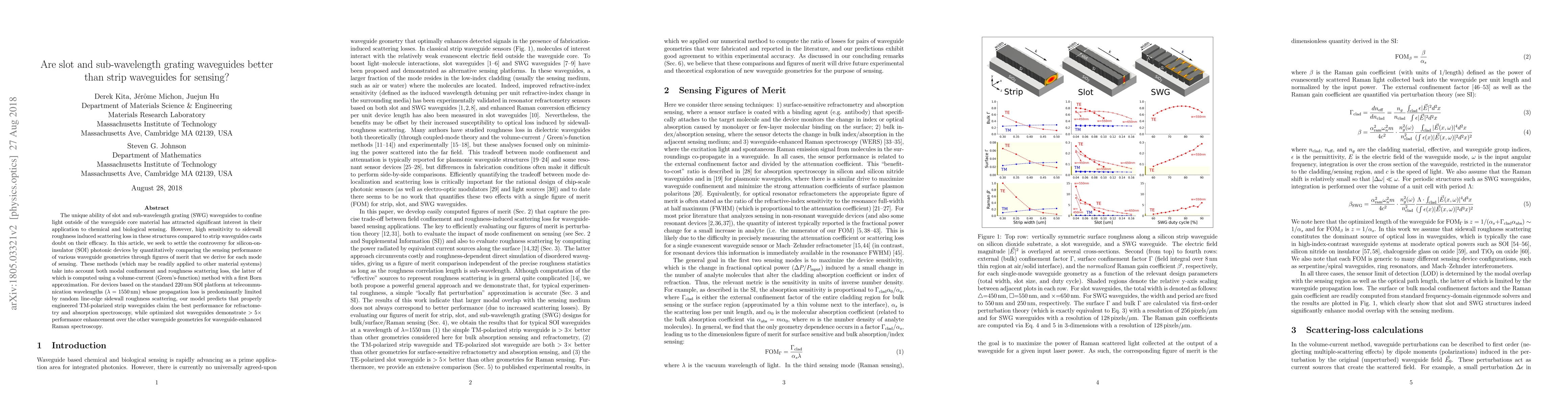 This paper compares the sensing performance of slot and sub-wavelength grating waveguides to strip waveguides, finding that while optimized slot waveguides show significant improvement for Raman spectroscopy, properly engineered strip waveguides outperform for refractometry and absorption spectroscopy due to lower scattering losses.