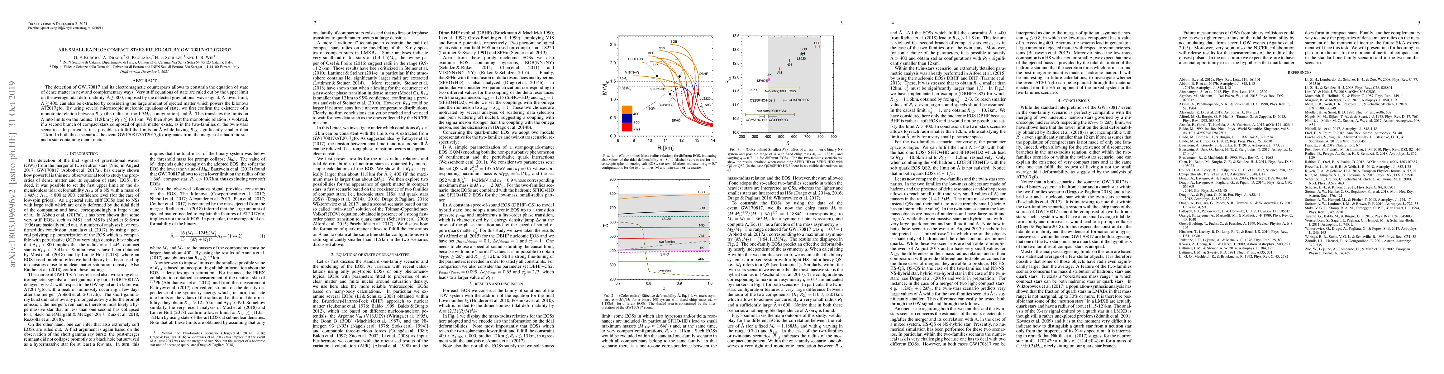 The detection of GW170817 and its electromagnetic counterparts allows to constrain the equation of state of dense matter in new and complementary ways. Very stiff equations of state are ruled out by the upper limit on the average tidal deformability, $\tilde\Lambda \lesssim 800$, imposed by the detected gravitational wave signal. A lower limit, $\tilde\Lambda \gtrsim 400$, can also be extracted by considering the large amount of ejected matter which powers the kilonova AT2017gfo. By using several microscopic nucleonic equations of state, we first confirm the existence of a monotonic relation between $R_{1.5}$ (the radius of the $1.5M_{\odot}$ configuration) and $\tilde\Lambda$. This translates the limits on $\tilde\Lambda$ into limits on the radius: $11.8\,\text{km} \lesssim R_{1.5} \lesssim 13.1\,$km. We then show that the monotonic relation is violated, if a second branch of compact stars composed of quark matter exists, as in the two-families or the twin-stars scenarios. In particular, it is possible to fulfill the limits on $\tilde\Lambda$ while having $R_{1.5}$ significantly smaller than $12\,$km. In both those scenarios the event GW170817/AT2017gfo originates from the merger of a hadronic star and a star containing quark matter.
