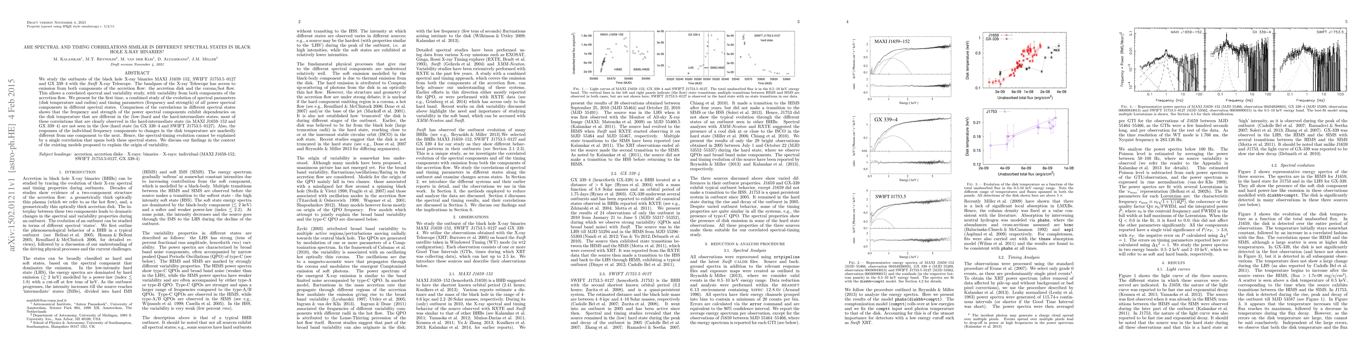 We study the outbursts of the black hole X-ray binaries MAXI J1659-152, SWIFT J1753.5--0127 and GX 339-4 with the Swift X-ray Telescope. The bandpass of the X-ray Telescope has access to emission from both components of the accretion flow: the accretion disk and the corona/hot flow. This allows a correlated spectral and variability study, with variability from both components of the accretion flow. We present for the first time, a combined study of the evolution of spectral parameters (disk temperature and radius) and timing parameters (frequency and strength) of all power spectral components in different spectral states. Comparison of the correlations in different spectral states shows that the frequency and strength of the power spectral components exhibit dependencies on the disk temperature that are different in the (low-)hard and the hard-intermediate states; most of these correlations that are clearly observed in the hard-intermediate state (in MAXI J1659-152 and GX 339-4) are not seen in the (low-)hard state (in GX 339-4 and SWIFT J1753.5-0127). Also, the responses of the individual frequency components to changes in the disk temperature are markedly different from one component to the next. Hence, the spectral-timing evolution cannot be explained by a single correlation that spans both these spectral states. We discuss our findings in the context of the existing models proposed to explain the origin of variability.