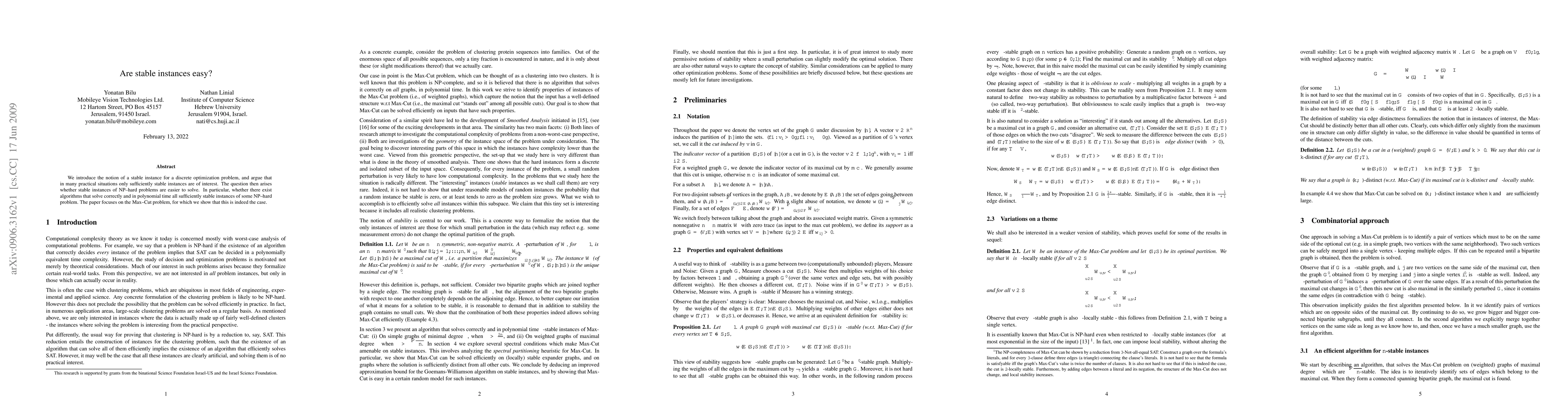 This paper introduces the concept of stable instances for optimization problems, particularly focusing on the Max-Cut problem. It demonstrates that sufficiently stable instances of this NP-hard problem can be solved correctly and in polynomial time.