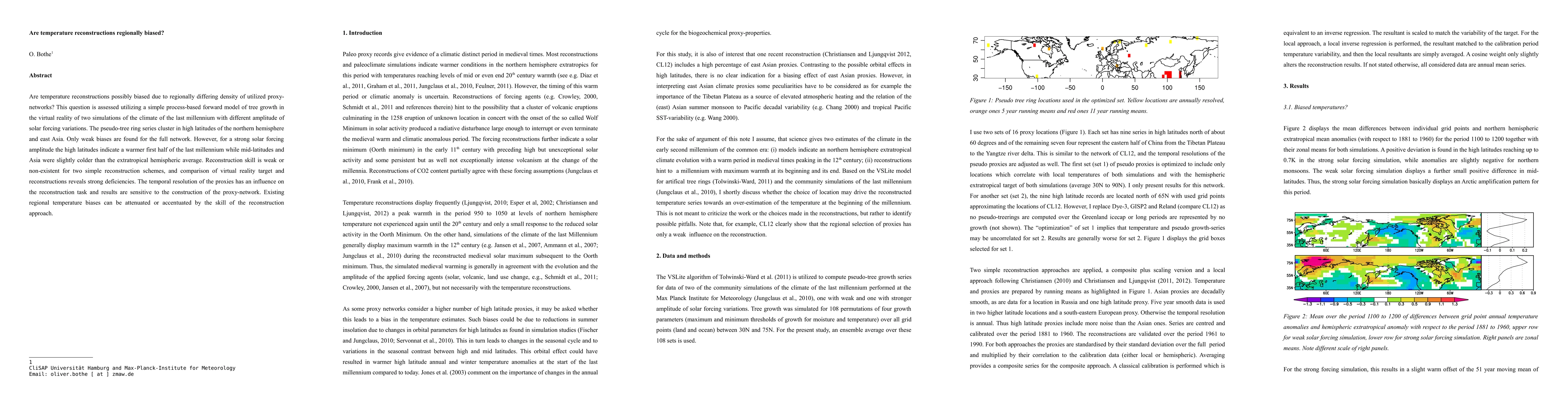 Temperature reconstructions may be regionally biased due to varying proxy network densities, with high latitudes showing warmer conditions in the past and mid-latitudes cooler conditions compared to global averages.