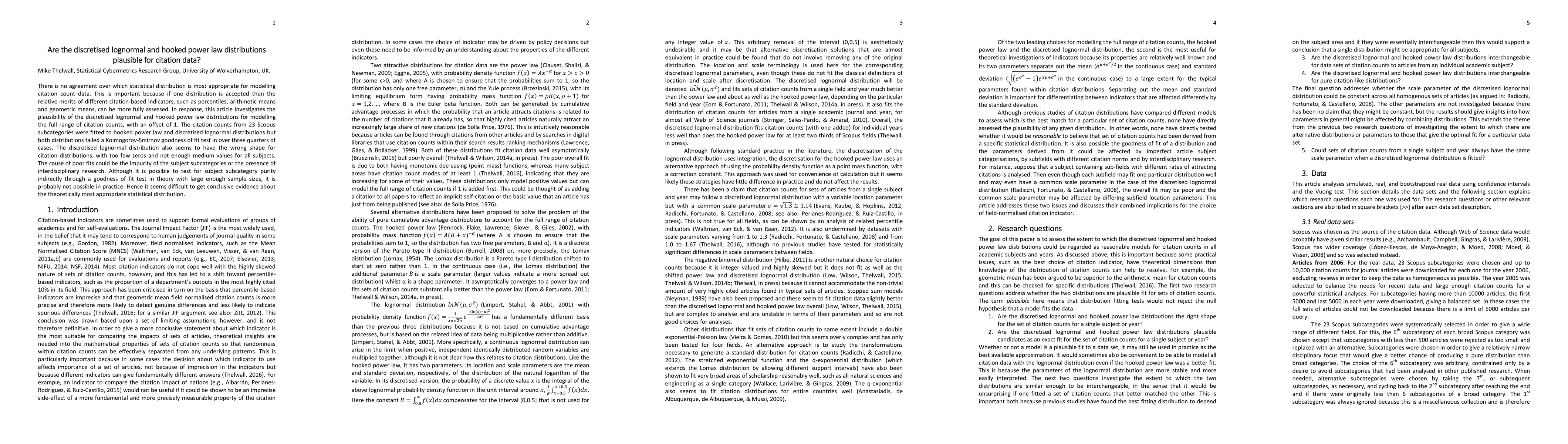 This paper examines the suitability of discretised lognormal and hooked power law distributions for citation count data but finds both fail to fit well in most cases, raising questions about the appropriate statistical model for citation-based indicators. The poor fit may stem from subject subcategory impurity or interdisciplinary research.