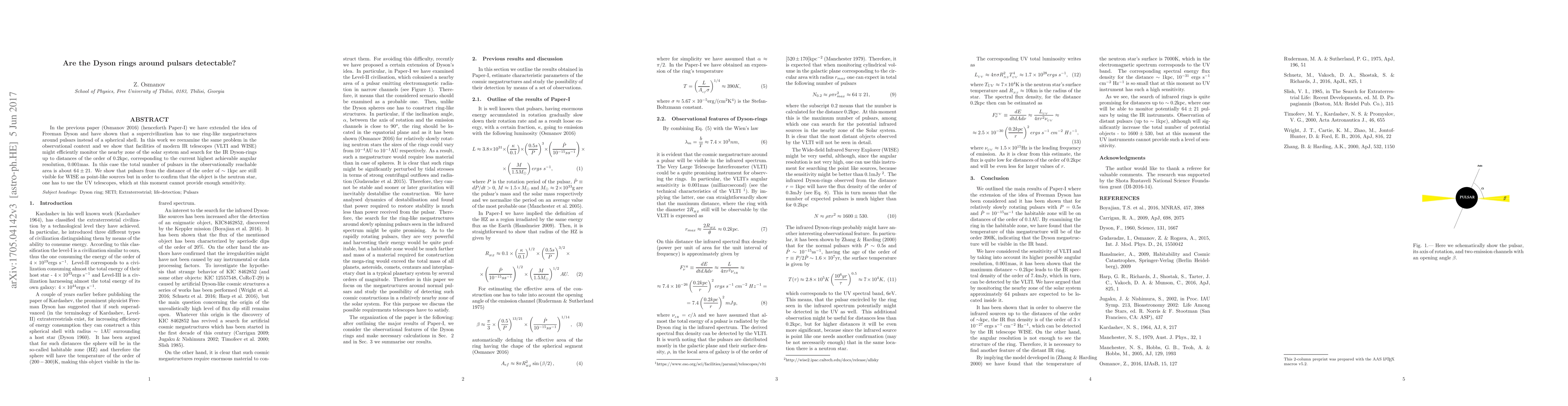 In the previous paper (Osmanov 2016) (henceforth Paper-I) we have extended the idea of Freeman Dyson and have shown that a supercivilization has to use ring-like megastructures around pulsars instead of a spherical shell. In this work we reexamine the same problem in the observational context and we show that facilities of modern IR telescopes (VLTI and WISE) might efficiently monitor the nearby zone of the solar system and search for the IR Dyson-rings up to distances of the order of $0.2$kpc, corresponding to the current highest achievable angular resolution, $0.001$mas. In this case the total number of pulsars in the observationally reachable area is about $64\pm 21$. We show that pulsars from the distance of the order of $\sim 1$kpc are still visible for WISE as point-like sources but in order to confirm that the object is the neutron star, one has to use the UV telescopes, which at this moment cannot provide enough sensitivity.