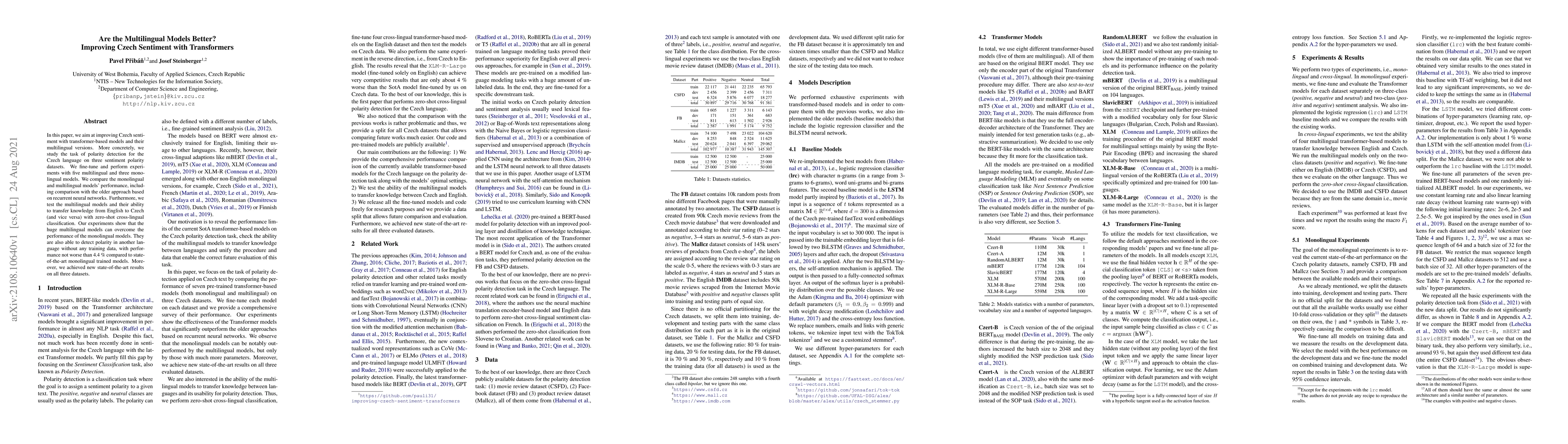 In this paper, we aim at improving Czech sentiment with transformer-based models and their multilingual versions. More concretely, we study the task of polarity detection for the Czech language on three sentiment polarity datasets. We fine-tune and perform experiments with five multilingual and three monolingual models. We compare the monolingual and multilingual models' performance, including comparison with the older approach based on recurrent neural networks. Furthermore, we test the multilingual models and their ability to transfer knowledge from English to Czech (and vice versa) with zero-shot cross-lingual classification. Our experiments show that the huge multilingual models can overcome the performance of the monolingual models. They are also able to detect polarity in another language without any training data, with performance not worse than 4.4 % compared to state-of-the-art monolingual trained models. Moreover, we achieved new state-of-the-art results on all three datasets.