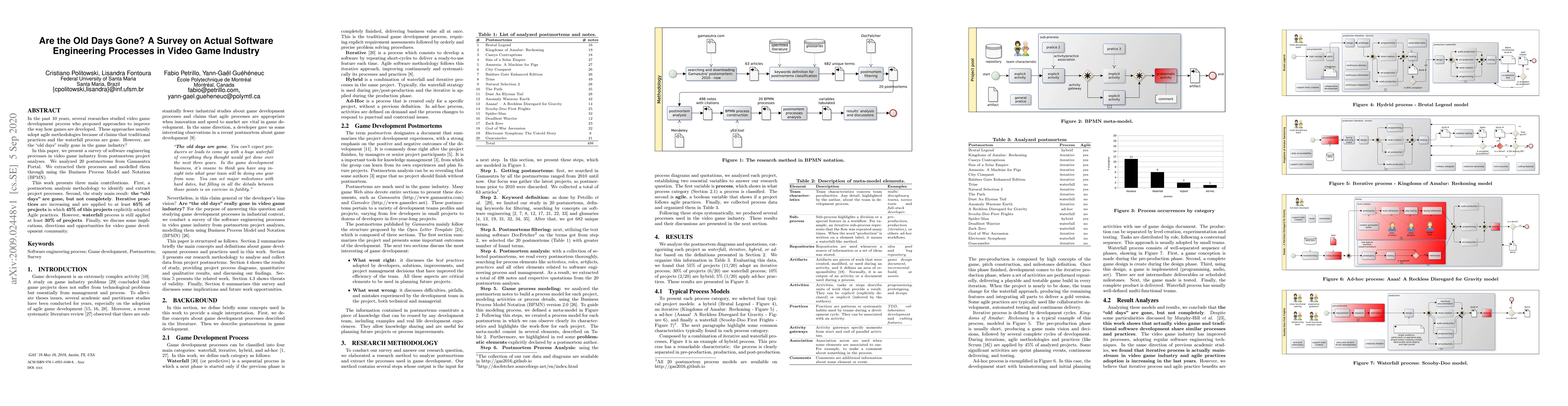 This paper surveys software engineering processes in the video game industry through postmortem analyses, finding that while iterative and Agile practices are increasingly common (used in 65% of projects), traditional waterfall processes still persist in 30% of projects. The study proposes a new methodology for analyzing project processes and discusses implications for the industry.