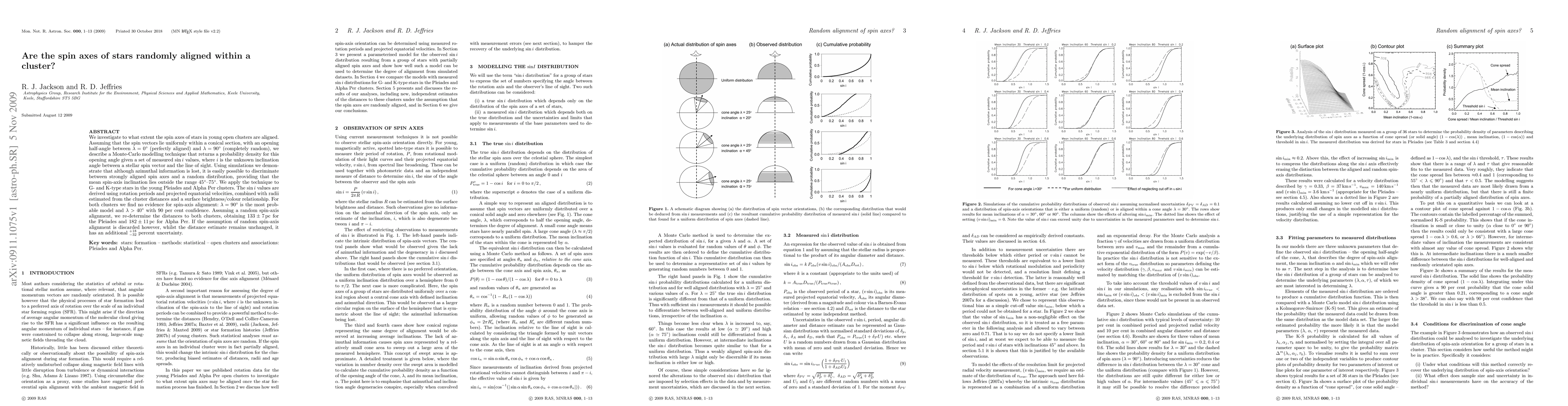 We investigate to what extent the spin axes of stars in young open clusters are aligned. Assuming that the spin vectors lie uniformly within a conical section, with an opening half-angle between lambda=0 (perfectly aligned) and lambda=90 degrees(completely random), we describe a Monte-Carlo modelling technique that returns a probability density for this opening angle given a set of measured sin i values, where i is the unknown inclination angle between a stellar spin vector and the line of sight. Using simulations we demonstrate that although azimuthal information is lost, it is easily possible to discriminate between strongly aligned spin axes and a random distribution, providing that the mean spin-axis inclination lies outside the range 45--75 degrees. We apply the technique to G- and K-type stars in the young Pleiades and Alpha Per clusters. The sin i values are derived using rotation periods and projected equatorial velocities, combined with radii estimated from the cluster distances and a surface brightness/colour relationship. For both clusters we find no evidence for spin-axis alignment: lambda=90 degrees is the most probable model and lambda>40 degrees with 90 per cent confidence. Assuming a random spin-axis alignment, we re-determine the distances to both clusters, obtaining 133+/-7pc for the Pleiades and 182+/-11 pc for Alpha Per. If the assumption of random spin-axis alignment is discarded however, whilst the distance estimate remains unchanged, it has an additional +18/-32 percent uncertainty.