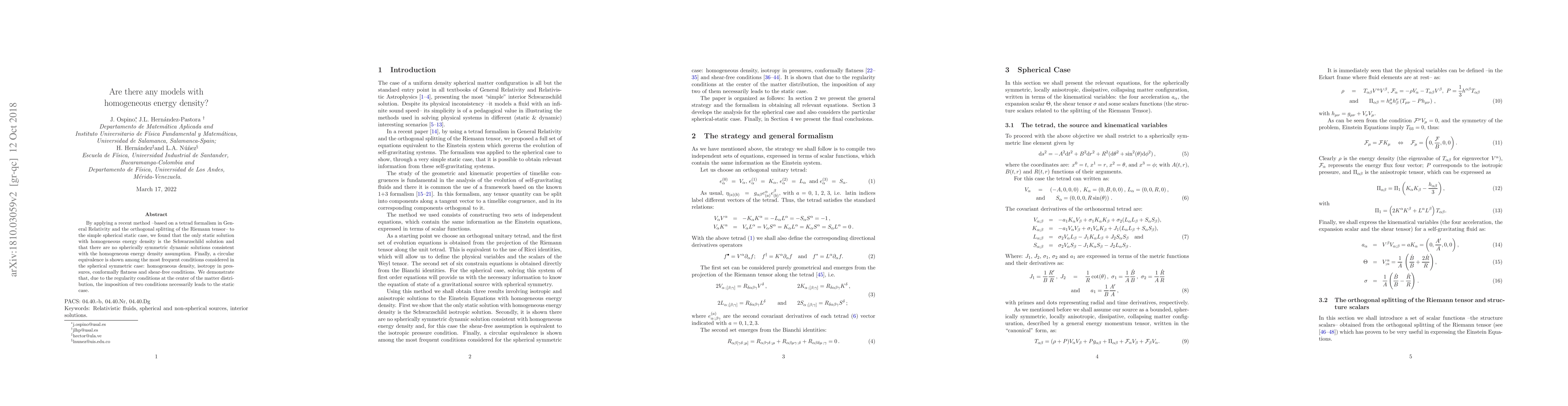 By applying a recent method --based on a tetrad formalism in General Relativity and the orthogonal splitting of the Riemann tensor-- to the simple spherical static case, we found that the only static solution with homogeneous energy density is the Schwarzschild solution and that there are no spherically symmetric dynamic solutions consistent with the homogeneous energy density assumption. Finally, a circular equivalence is shown among the most frequent conditions considered in the spherical symmetric case: homogeneous density, isotropy in pressures, conformally flatness and shear-free conditions. We demonstrate that, due to the regularity conditions at the center of the matter distribution, the imposition of two conditions necessarily leads to the static case.