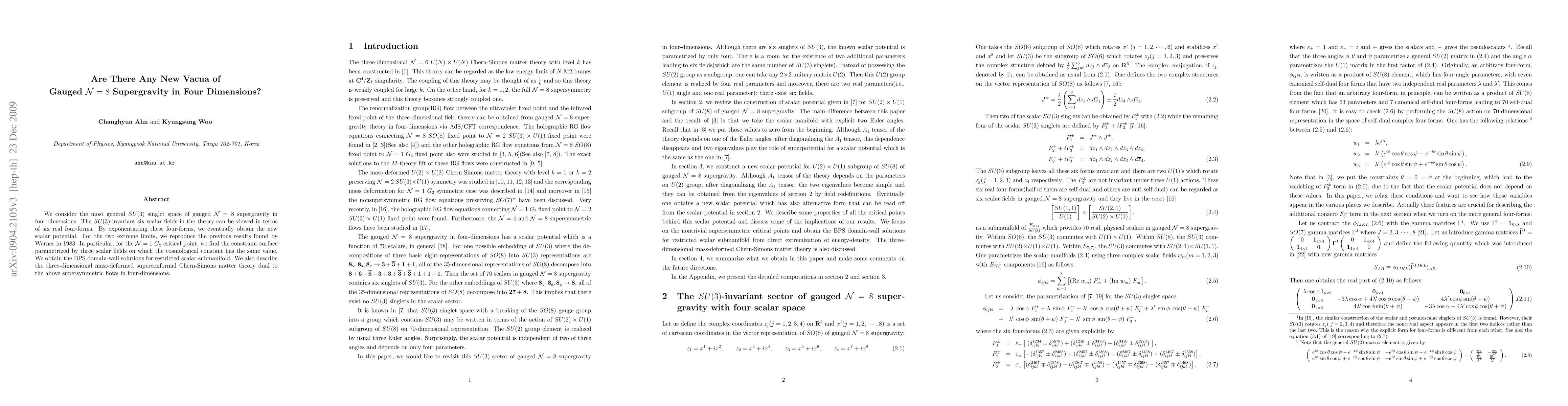 We consider the most general SU(3) singlet space of gauged N=8 supergravity in four-dimensions. The SU(3)-invariant six scalar fields in the theory can be viewed in terms of six real four-forms. By exponentiating these four-forms, we eventually obtain the new scalar potential. For the two extreme limits, we reproduce the previous results found by Warner in 1983. In particular, for the N=1 G_2 critical point, we find the constraint surface parametrized by three scalar fields on which the cosmological constant has the same value. We obtain the BPS domain-wall solutions for restricted scalar submanifold. We also describe the three-dimensional mass-deformed superconformal Chern-Simons matter theory dual to the above supersymmetric flows in four-dimensions.