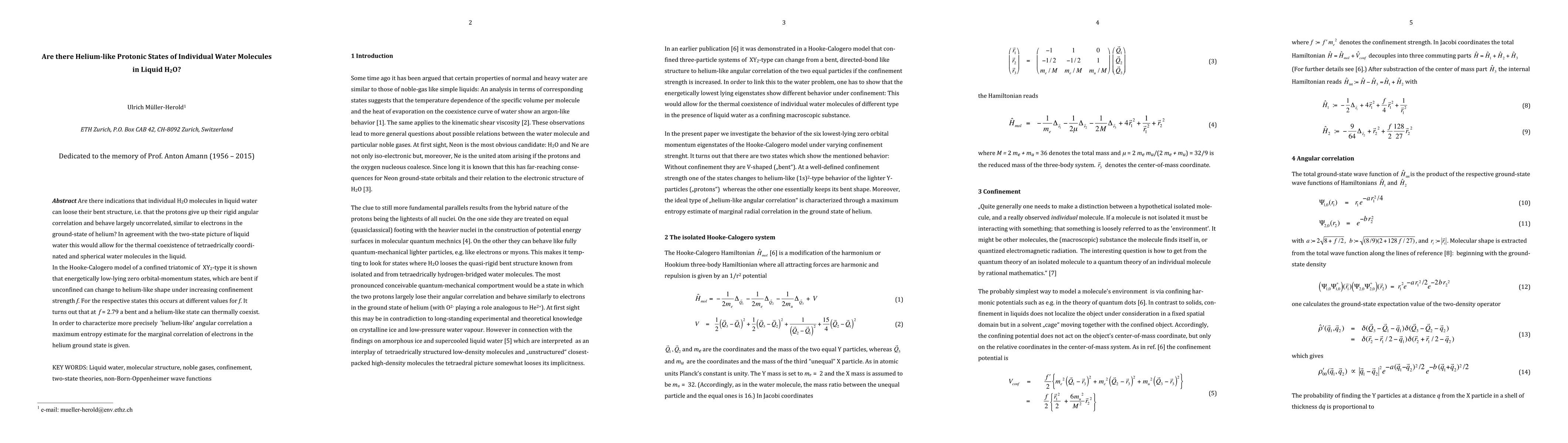 Are there indications that individual H2O molecules in liquid water can loose their bent structure, i.e. that the protons give up their rigid angular correlation and behave largely uncorrelated, similar to electrons in the ground-state of helium? In agreement with the two-state picture of liquid water this would allow for the thermal coexistence of tetraedrically coordinated and spherical water molecules in the liquid. In the Hooke-Calogero model of a confined triatomic of XY2-type it is shown that energetically low-lying zero orbital-momentum states, which are bent if unconfined can change to helium-like shape under increasing confinement strength f. For the respective states this occurs at different values for f. It turns out that at f = 2.79 a bent and a helium-like state can thermally coexist. In order to characterize more precisely 'helium-like' angular correlation a maximum entropy estimate for the marginal correlation of electrons in the helium ground state is given. KEY WORDS: Liquid water, molecular structure, noble gases, confinement, two-state theories, non-Born-Oppenheimer wave functions