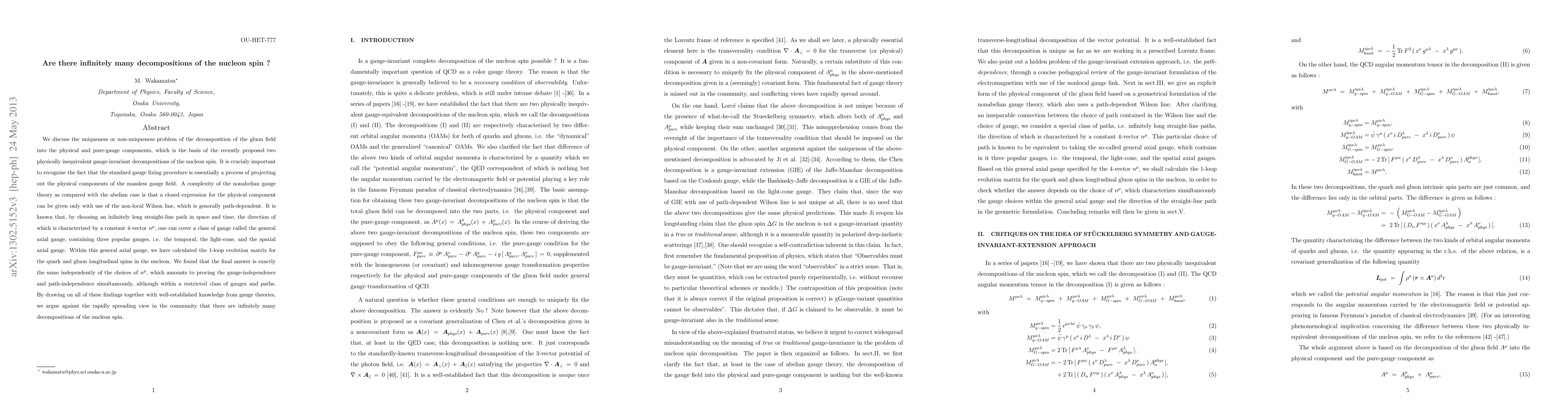 We discuss the uniqueness or non-uniqueness problem of the decomposition of the gluon field into the physical and pure-gauge components, which is the basis of the recently proposed two physically inequivalent gauge-invariant decompositions of the nucleon spin. It is crucialy important to recognize the fact that the standard gauge fixing procedure is essentially a process of projecting out the physical components of the massless gauge field. A complexity of the nonabelian gauge theory as compared with the abelian case is that a closed expression for the physical component can be given only with use of the non-local Wilson line, which is generally path-dependent. It is known that, by choosing an infinitely long straight-line path in space and time, the direction of which is characterized by a constant 4-vector $n^\mu$, one can cover a class of gauge called the general axial gauge, containing three popular gauges, i.e. the temporal, the light-cone, and the spatial axial gauge. Within this general axial gauge, we have calculated the 1-loop evolution matrix for the quark and gluon longitudinal spins in the nucleon. We found that the final answer is exactly the same independently of the choices of $n^\mu$, which amounts to proving the gauge-independence and path-independence simultaneously, although within a restricted class of gauges and paths. By drawing on all of these findings together with well-established knowledge from gauge theories, we argue against the rapidly spreading view in the community that there are infinitely many decompositions of the nucleon spin.