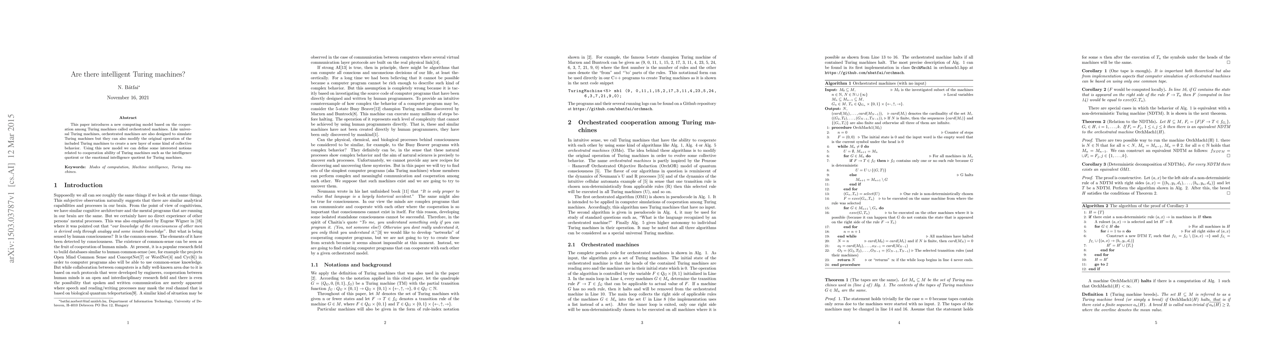 This paper introduces a new computing model based on the cooperation among Turing machines called orchestrated machines. Like universal Turing machines, orchestrated machines are also designed to simulate Turing machines but they can also modify the original operation of the included Turing machines to create a new layer of some kind of collective behavior. Using this new model we can define some interested notions related to cooperation ability of Turing machines such as the intelligence quotient or the emotional intelligence quotient for Turing machines.