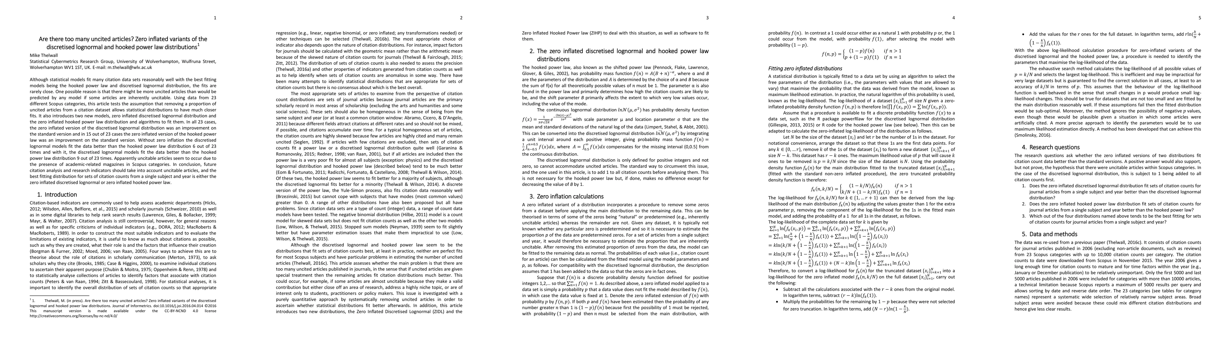This paper investigates whether there are more uncited articles than predicted by existing citation models, proposing zero inflated variants of the discretised lognormal and hooked power law distributions to better fit citation data. The study finds that zero inflated models improve fit in most cases, suggesting that uncitable articles, especially from academic-related magazines, should be considered in future citation analysis.