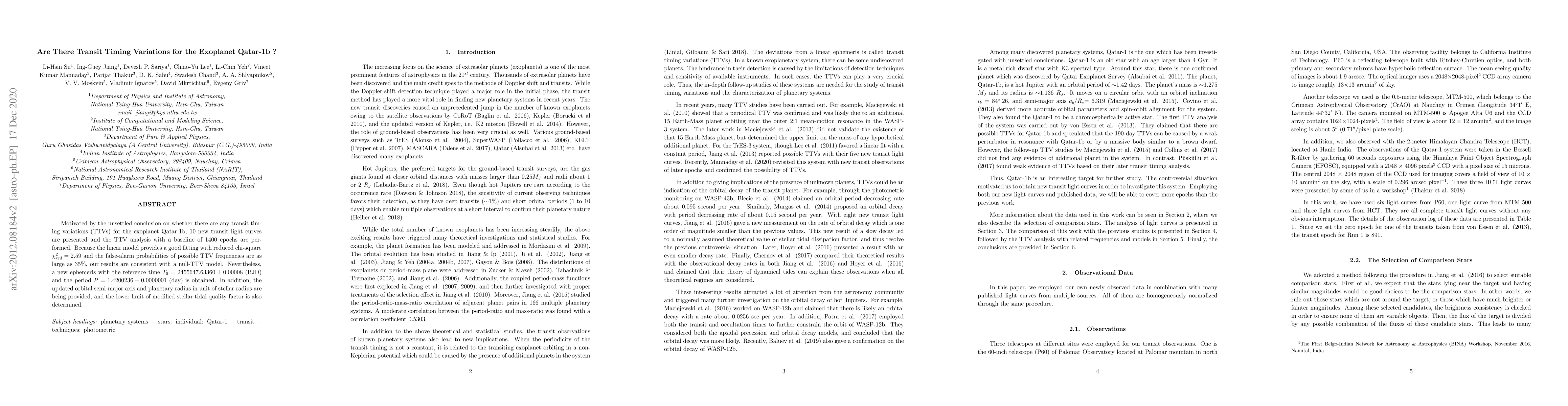 Motivated by the unsettled conclusion on whether there are any transit timing variations (TTVs) for the exoplanet Qatar-1b, 10 new transit light curves are presented and the TTV analysis with a baseline of 1400 epochs are performed. Because the linear model provides a good fitting with reduced chi-square = 2.59 and the false-alarm probabilities of possible TTV frequencies are as large as 35 %, our results are consistent with a null-TTV model. Nevertheless, a new ephemeris with the reference time T_0 = 2455647.63360\pm 0.00008 (BJD) and the period P= 1.4200236\pm 0.0000001 (day) is obtained. In addition, the updated orbital semi-major axis and planetary radius in unit of stellar radius are being provided, and the lower limit of modified stellar tidal quality factor is also determined.
