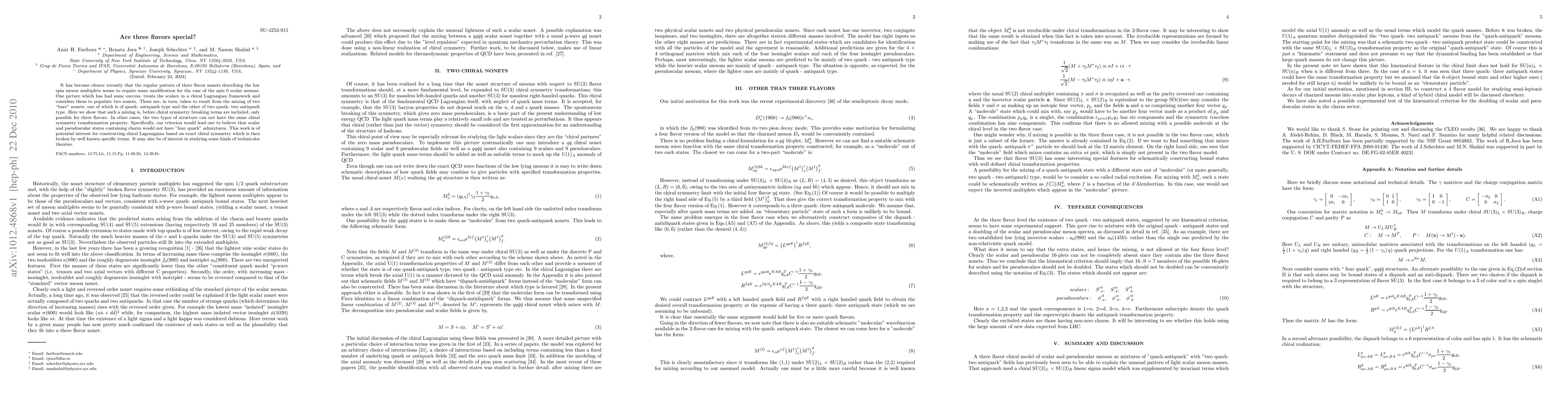 It has become clearer recently that the regular pattern of three flavor nonets describing the low spin meson multiplets seems to require some modification for the case of the spin 0 scalar mesons. One picture which has had some success, treats the scalars in a chiral Lagrangian framework and considers them to populate two nonets. These are, in turn, taken to result from the mixing of two "bare" nonets, one of which is of quark- antiquark type and the other of two quark- two antiquark type. Here we show that such a mixing is, before chiral symmetry breaking terms are included, only possible for three flavors. In other cases, the two types of structure can not have the same chiral symmetry transformation property. Specifically, our criterion would lead one to believe that scalar and pseudoscalar states containing charm would not have "four quark" admixtures. This work is of potential interest for constructing chiral Lagrangians based on exact chiral symmetry which is then broken by well known specific terms. It may also be of interest in studying some kinds of technicolor theories.
